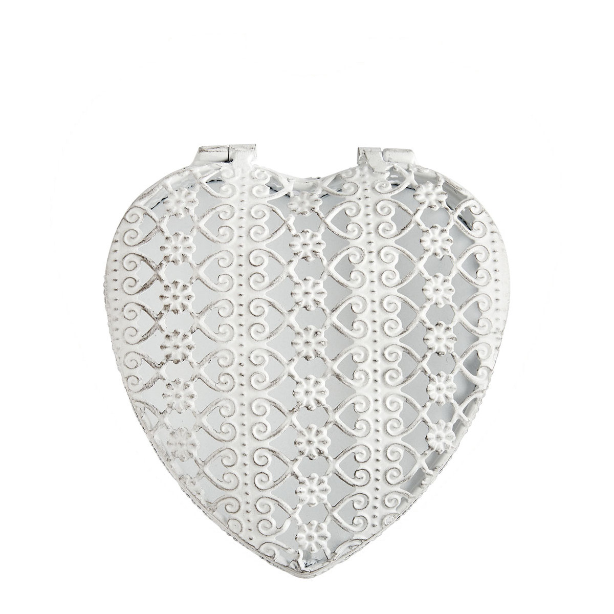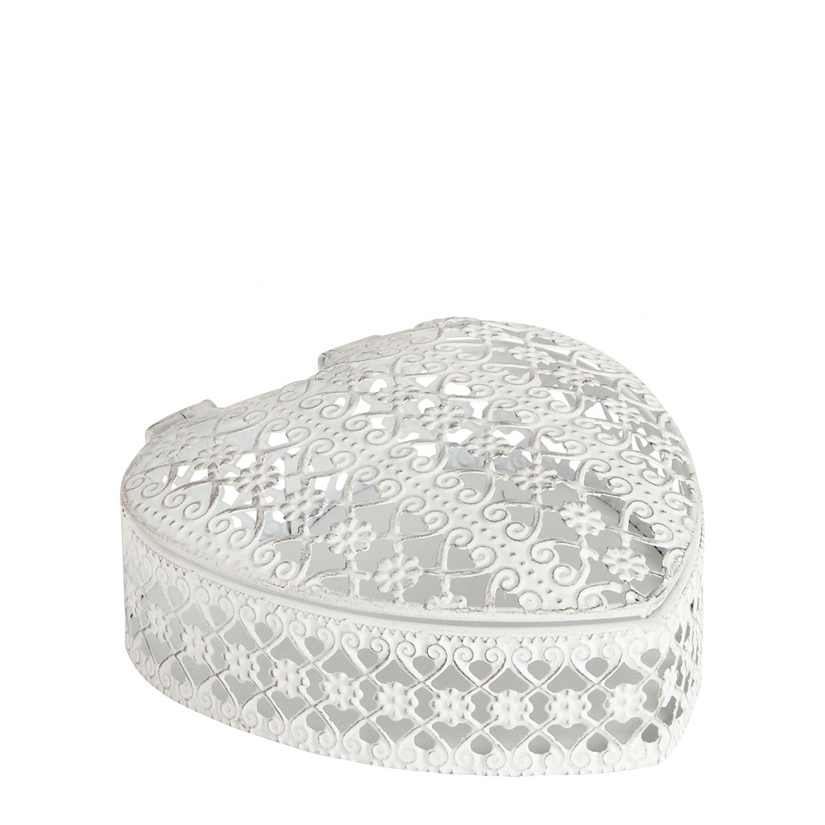 Romance comes to your décor with this delicate heart-shaped jewellery box. Intricately crafted, it reveals an elegant openwork decoration with floral arabesques that lend it all the charm of a precious object. Its whitened metal finish brings softness and radiance, for a piece that is both refined and timeless.