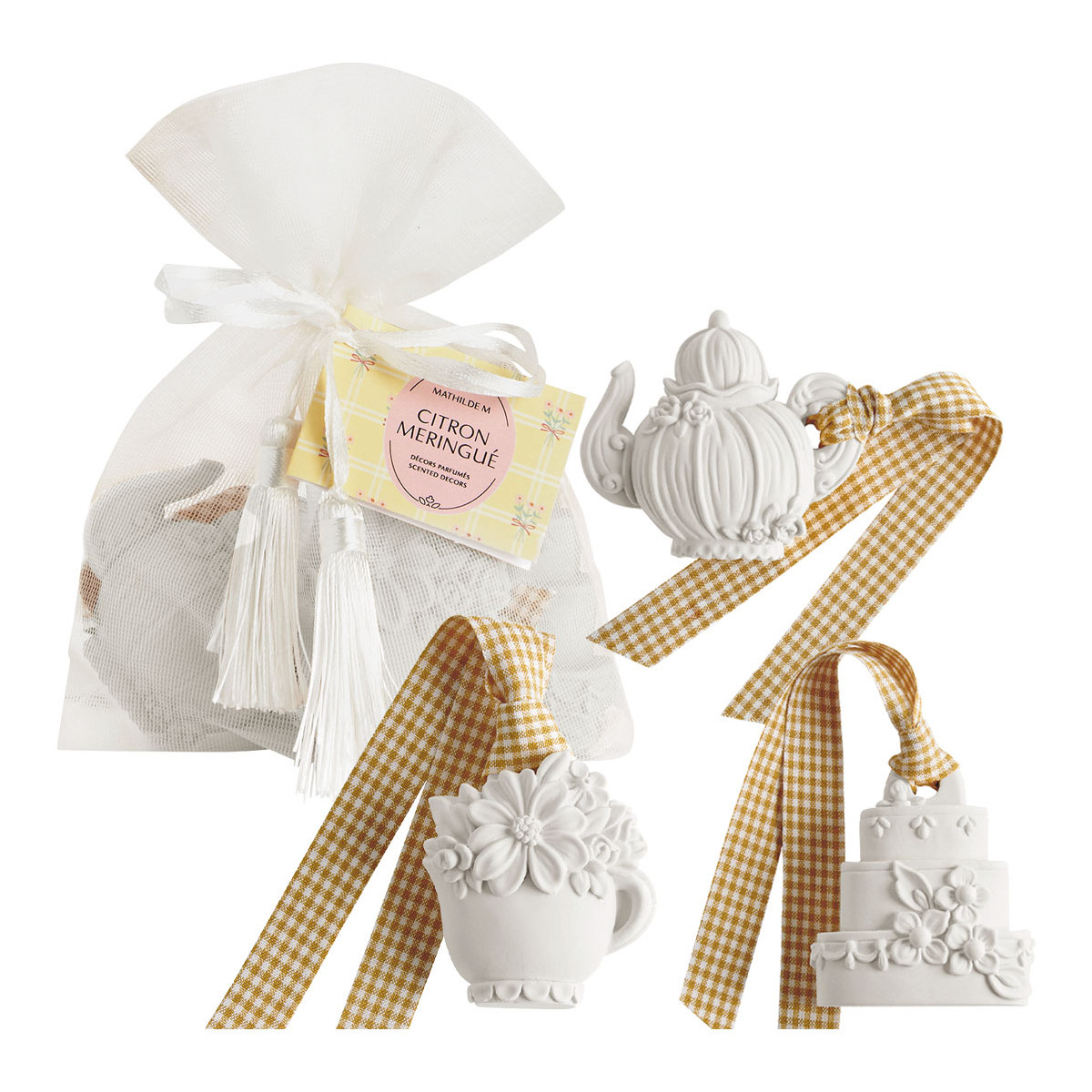 3 plaster decorations (Cup, Teapot and Cake), Citron Meringué fragrance