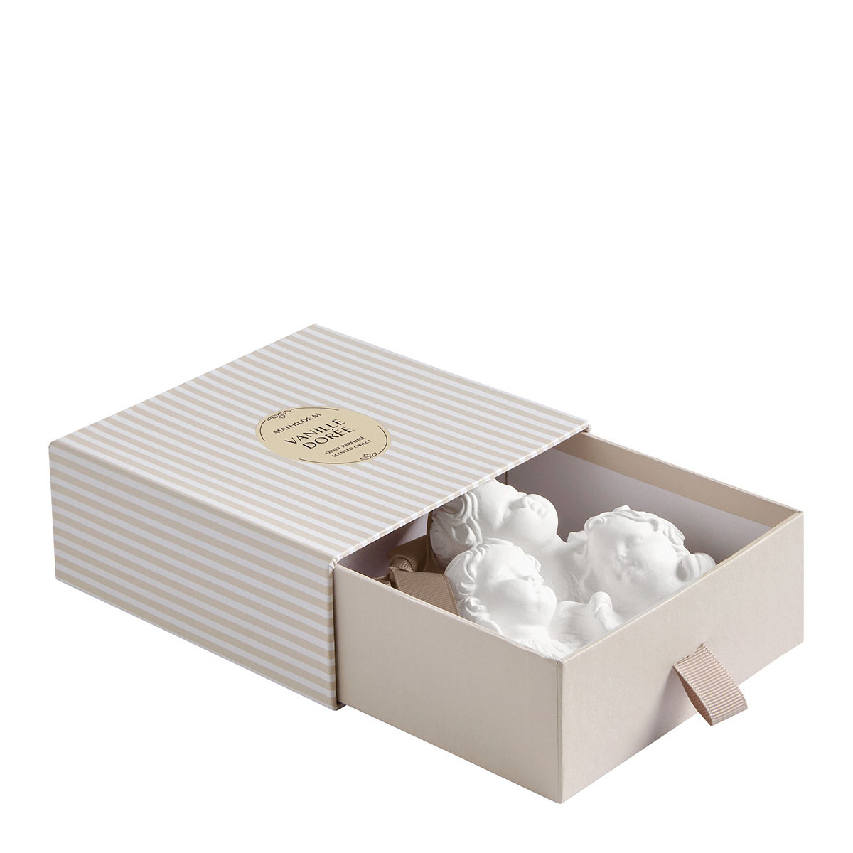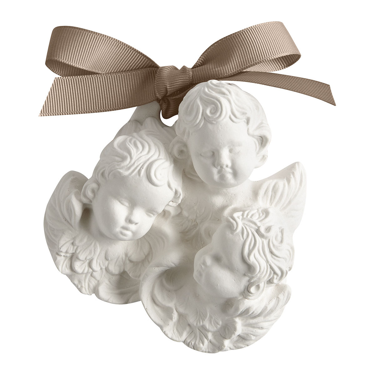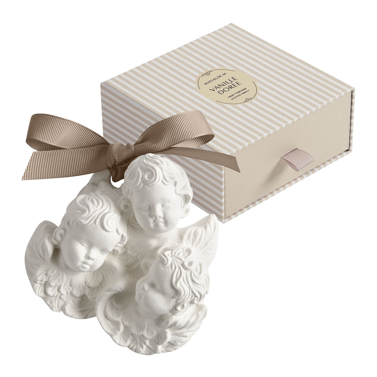 Entirely handcrafted, this trio of plaster Cherubs, with their tender and benevolent faces, will delicately and lastingly perfume all the small spaces of your home, such as wardrobes, drawers, or luggage. Placed in a small dish on a table, it transforms into a truly precious decorative object.