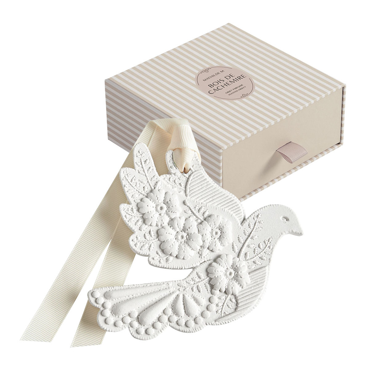 Entirely handcrafted, this plaster dove inspired by Provençal boutis delicately and lastingly perfumes all the small spaces of your home, such as wardrobes, drawers, or luggage. Placed in a small dish on a table, it transforms into a truly precious decorative object.