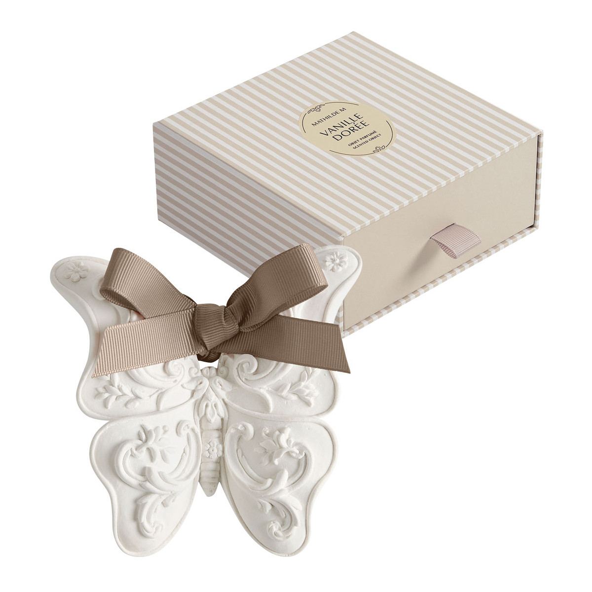 Entirely handcrafted, this plaster butterfly delicately and long-lastingly fragrances all the small spaces in your home, such as wardrobes, drawers or luggage. Placed in a small bowl on a table, it transforms into a truly precious decorative object.
