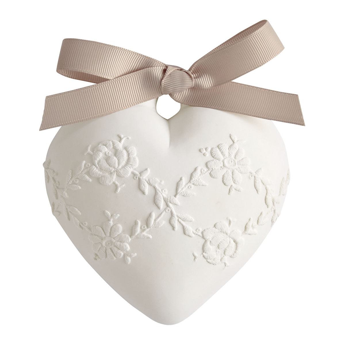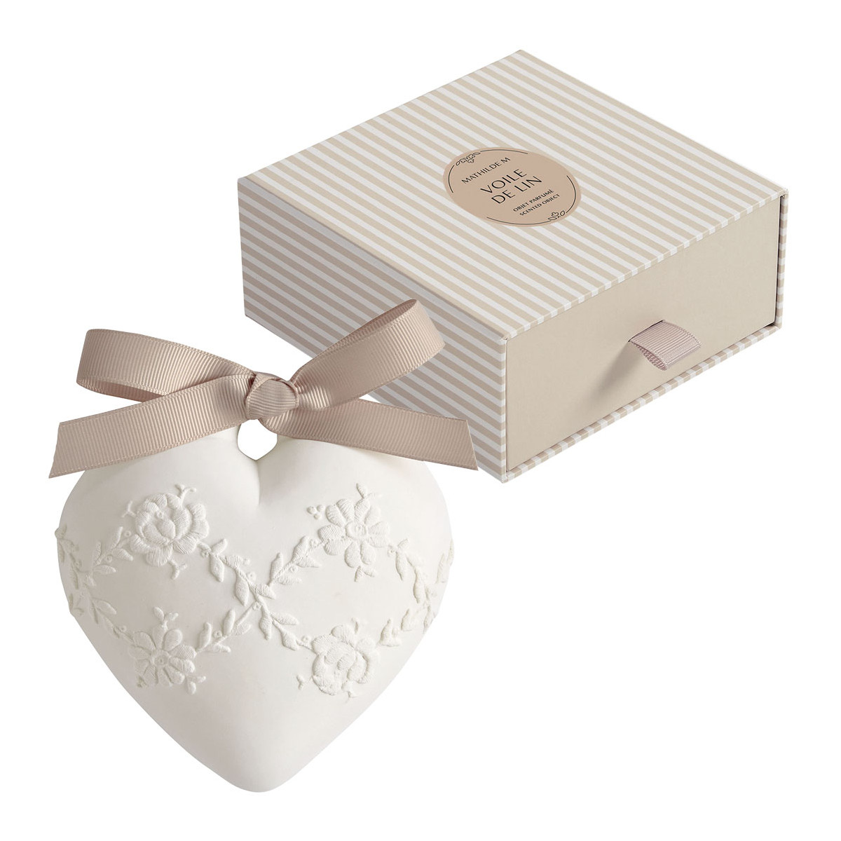 Entirely handcrafted, this plaster heart delicately perfumes for a long time all the small spaces of your home such as wardrobes, drawers or luggage. Placed in a small dish on a table, it transforms into a truly precious decorative object.