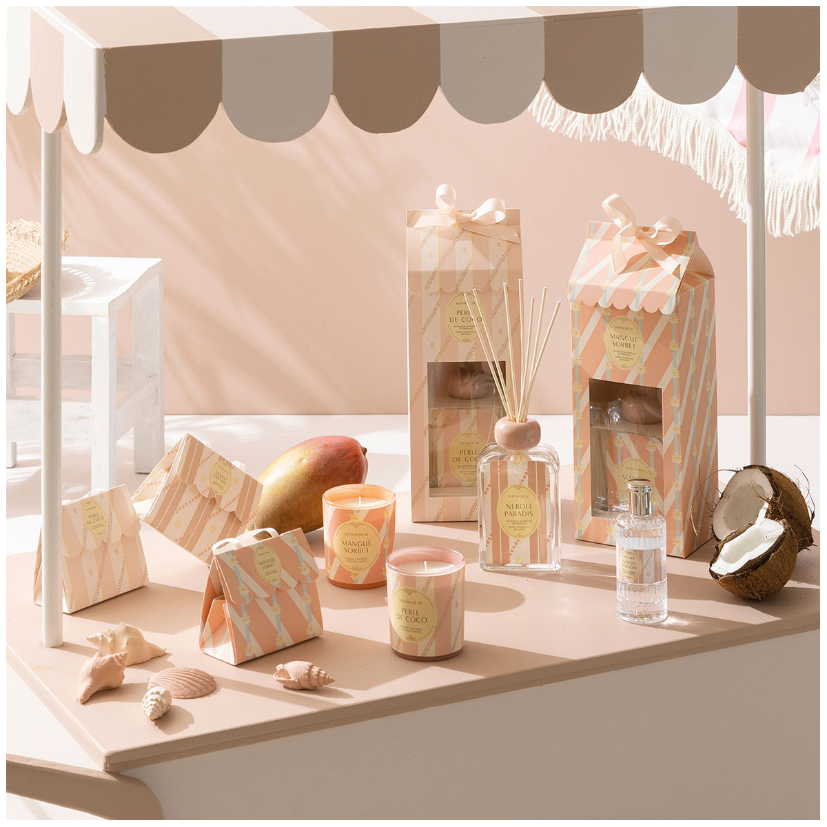 El Estudio de Creación Mathilde M se instala en verano bajo el sol a orillas del mar y se inspira poéticamente en las emblemáticas casetas de playa francesas y en el chic de las rayas, ese elemento gráfico atemporal reinterpretado con suavidad y fantasía en esta colección repleta de sol. Un paréntesis estival de colores aterciopelados que visten fragancias inéditas que huelen a verano: el aroma solar del neroli, la suavidad del coco y la adictiva dulzura del mango.