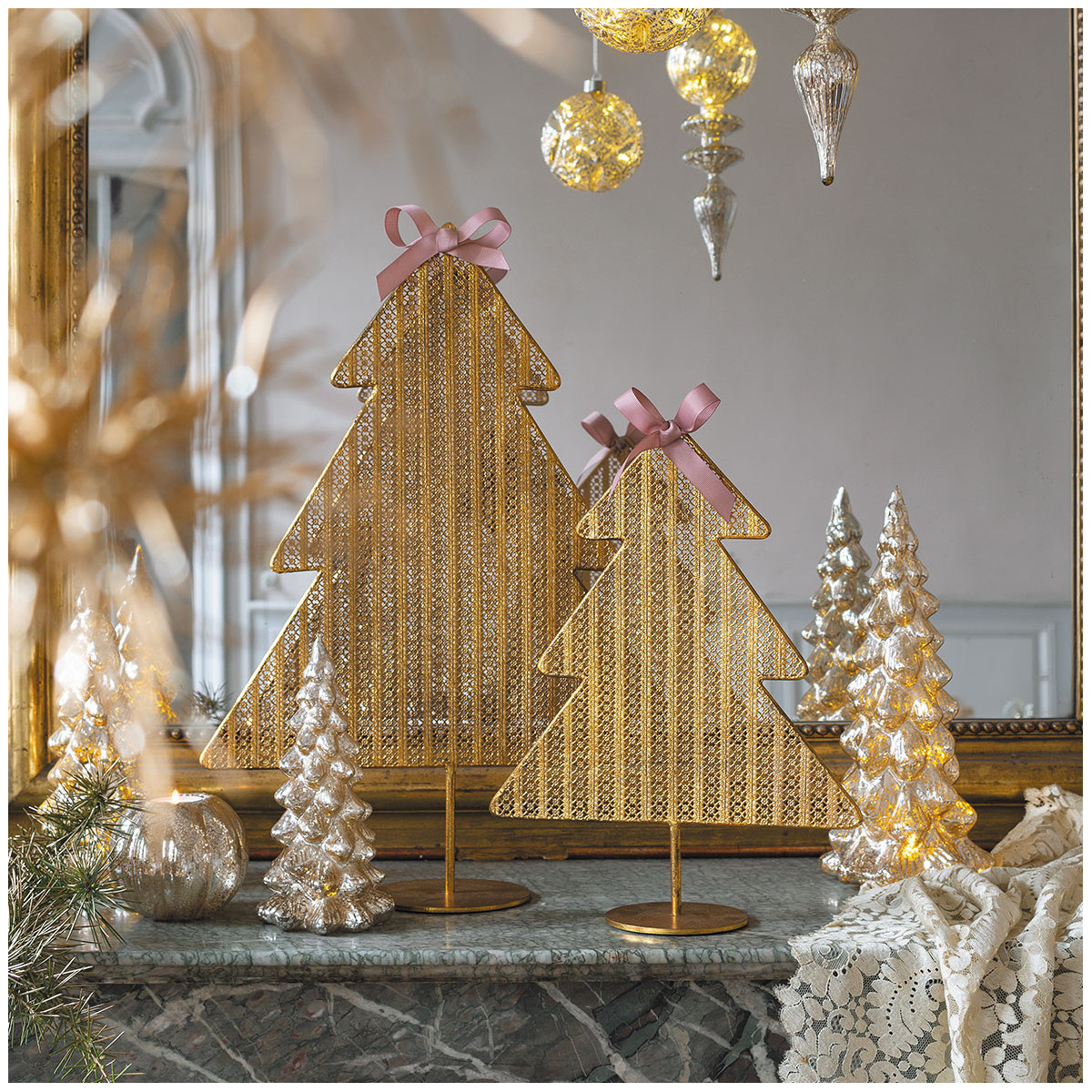 Su hogar adquiere un aire festivo con este Árbol de Navidad de Encaje Dorado. Encontrará su lugar en el centro de la mesa o en un mueble de la casa y aportará un toque refinado a su decoración navideña.
