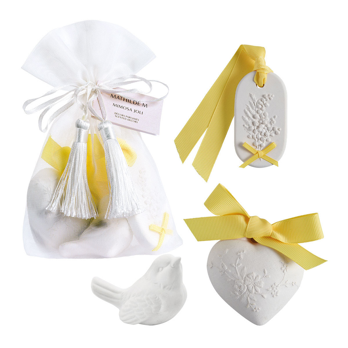 3 decoraciones de yeso (Mimosa, Pinzón y Corazón Bordado), perfume Mimosa Joli