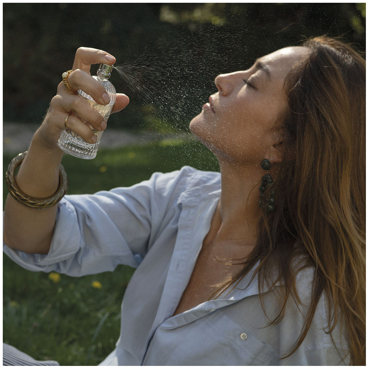 En un exquisito velo, esta bruma perfuma con ligereza el cuerpo y el cabello. Su fórmula compuesta por un 95% de ingredientes de origen natural y con baja concentración de alcohol perfuma sin dañar la piel y el cabello expuestos al sol. Déjese seducir por su elegante diseño inspirado en el siglo XVIII y completamente dibujado a mano, que refleja la personalidad y las notas sutiles del perfume que lo acompaña.