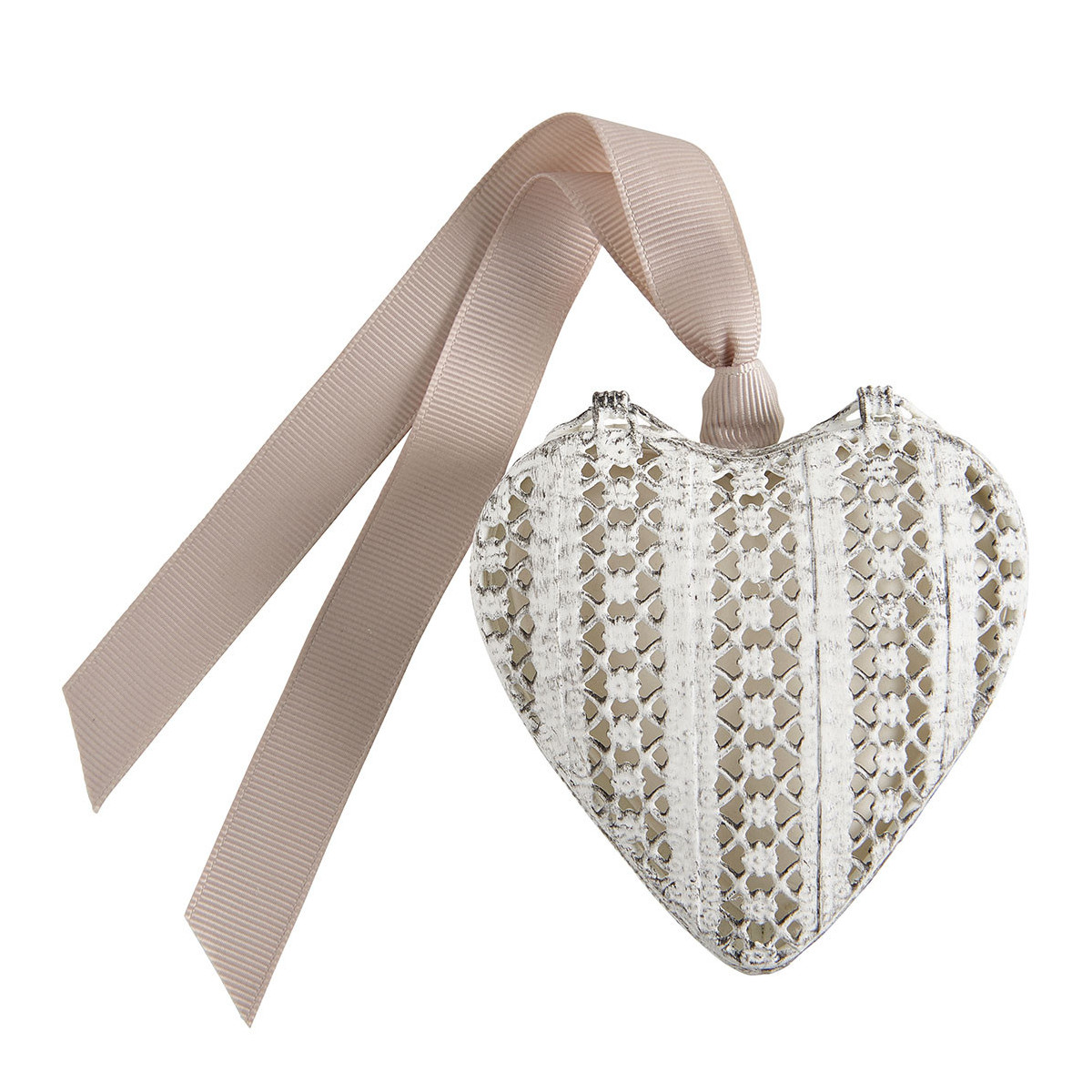 Añada un toque de romanticismo y delicadeza a su interior con esta irresistible joya decorativa de metal en forma de corazón. Inspirada en el encanto de antaño, revela sublimes detalles cincelados y contiene un hermoso corazón de yeso perfumado. Su delicada cinta perfecciona esta creación y le aporta un toque femenino y elegante, fiel al espíritu refinado de Mathilde M. Para colgar en una puerta, suspender de un pomo o simplemente colocar sobre un mueble.