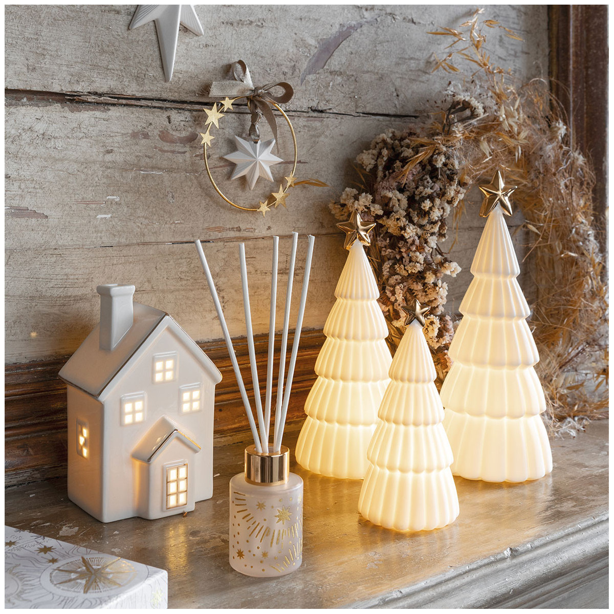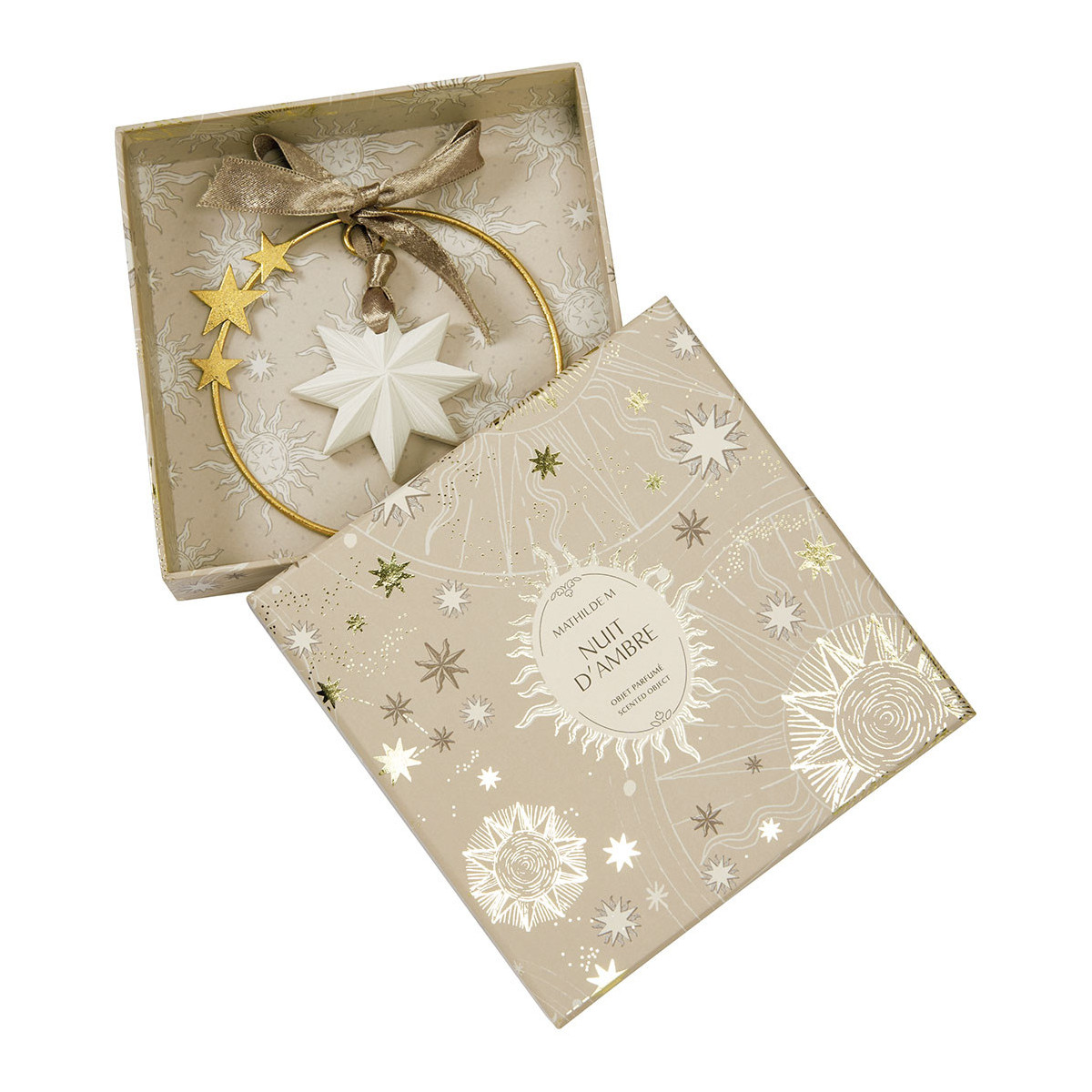 Añada un toque dorado a su decoración con esta magnífica corona Fiesta Celeste adornada con una delicada estrella de yeso perfumado. Para colgar en sus paredes o en el pomo de una puerta.