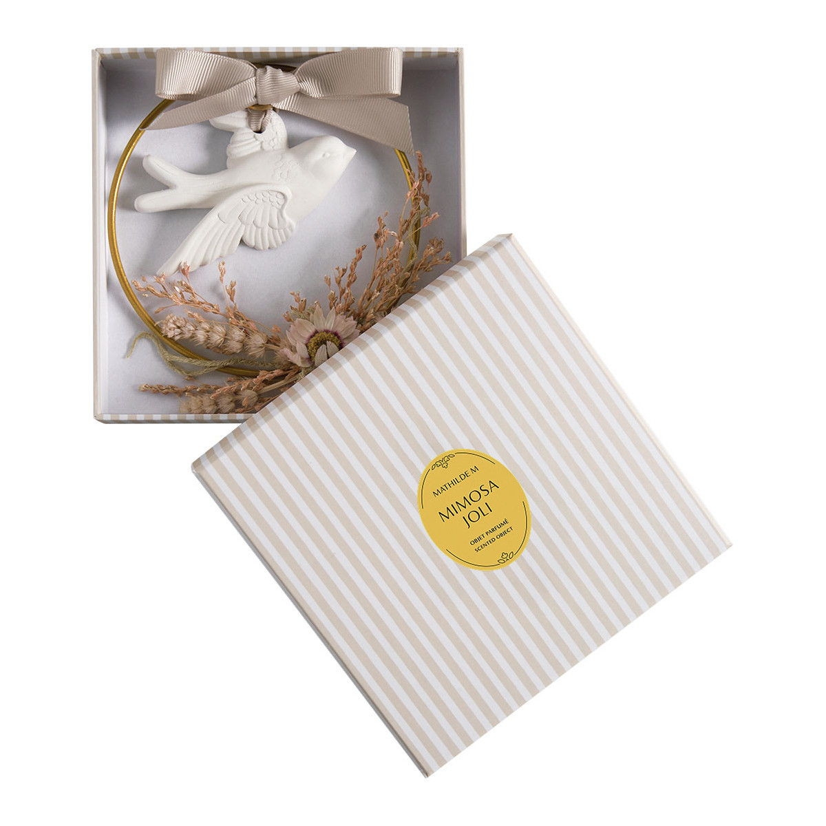 Un toque de poesía y refinamiento llega a tu interior con esta corona adornada con una paloma de yeso perfumado, suspendida de una elegante cinta satinada y realzada por un delicado conjunto de flores secas en tonos suaves y naturales. Será perfecta para realzar tus paredes.