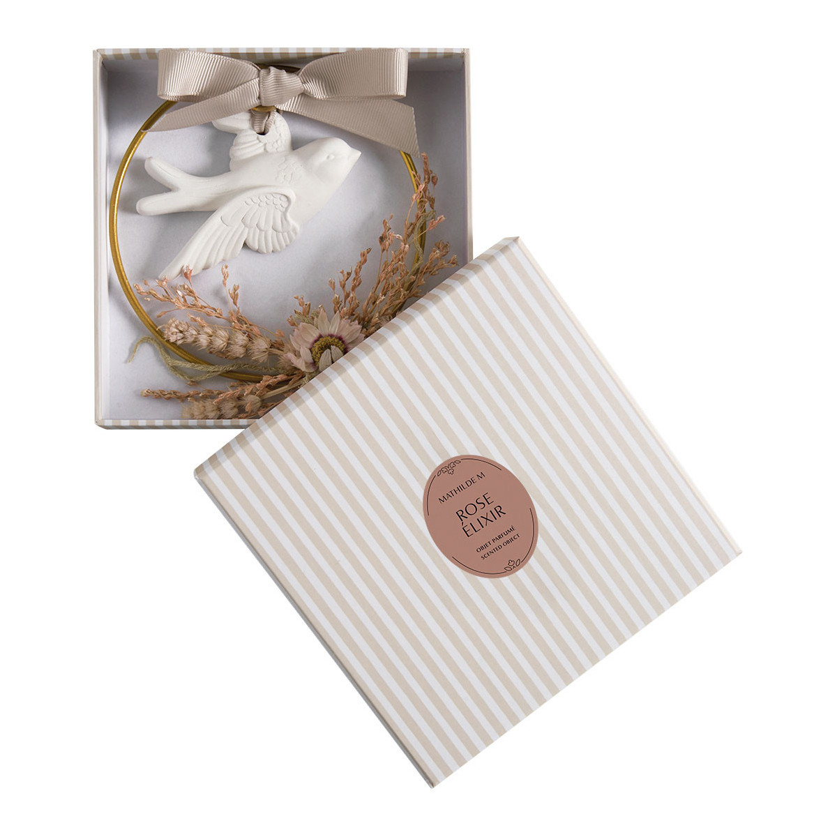 Un toque de poesía y refinamiento se invita a su interior con esta corona adornada con una paloma de yeso perfumado, suspendida de una elegante cinta satinada y realzada por un delicado conjunto de flores secas en tonos suaves y naturales. Será perfecta para embellecer sus paredes.