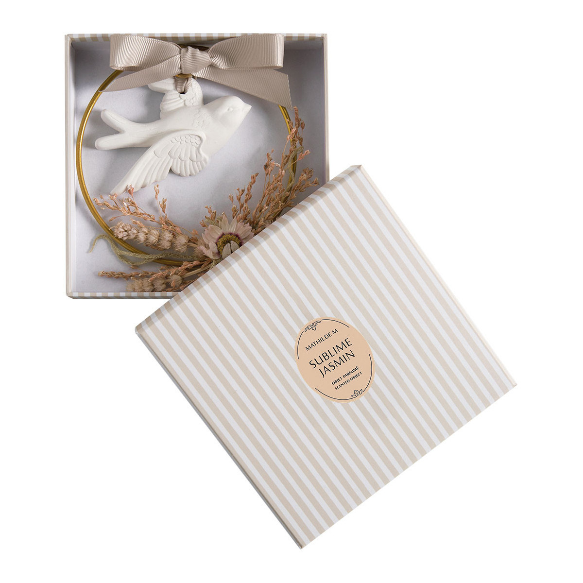Un toque de poesía y refinamiento se invita a su interior con esta corona adornada con una paloma de yeso perfumado, suspendida de una elegante cinta satinada y realzada por un delicado conjunto de flores secas en tonos suaves y naturales. Será perfecta para sublimar sus paredes.