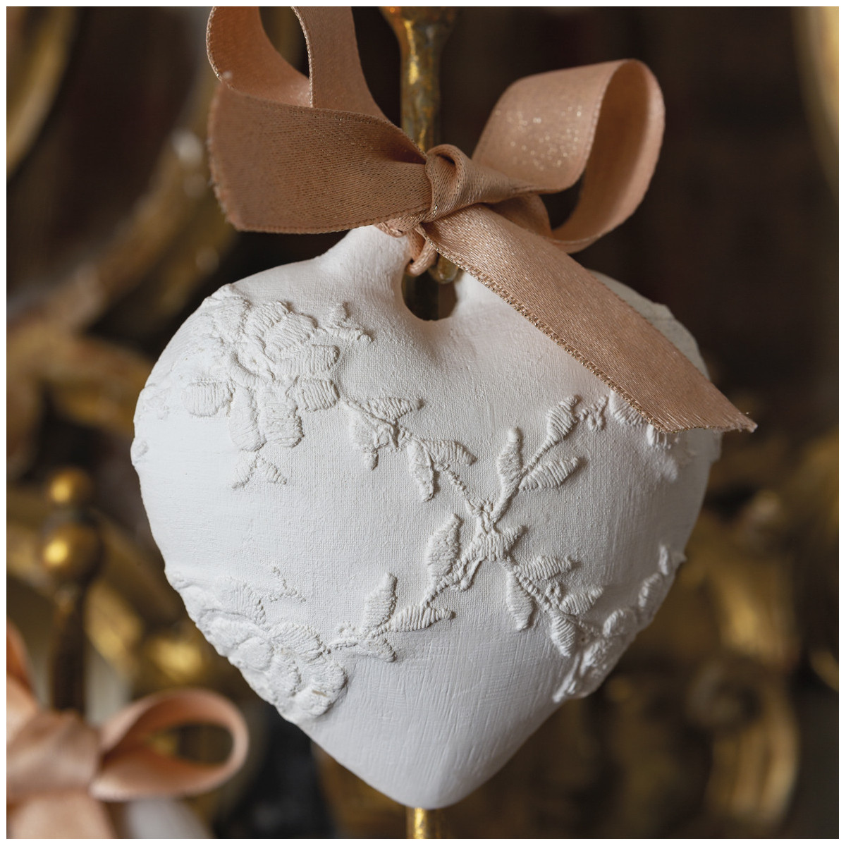 Verdadero objeto decorativo minuciosamente cincelado a mano y perfumado en nuestros talleres, este Corazón bordado en yeso deja una estela suave y permanente donde se coloca. Perfuma con delicadeza con Rose Élixir, un perfume voluptuoso y cautivador, matrimonio de la rosa, reina de las flores, y las notas empolvadas de la violeta, sobre un lecho de almizcles blancos.