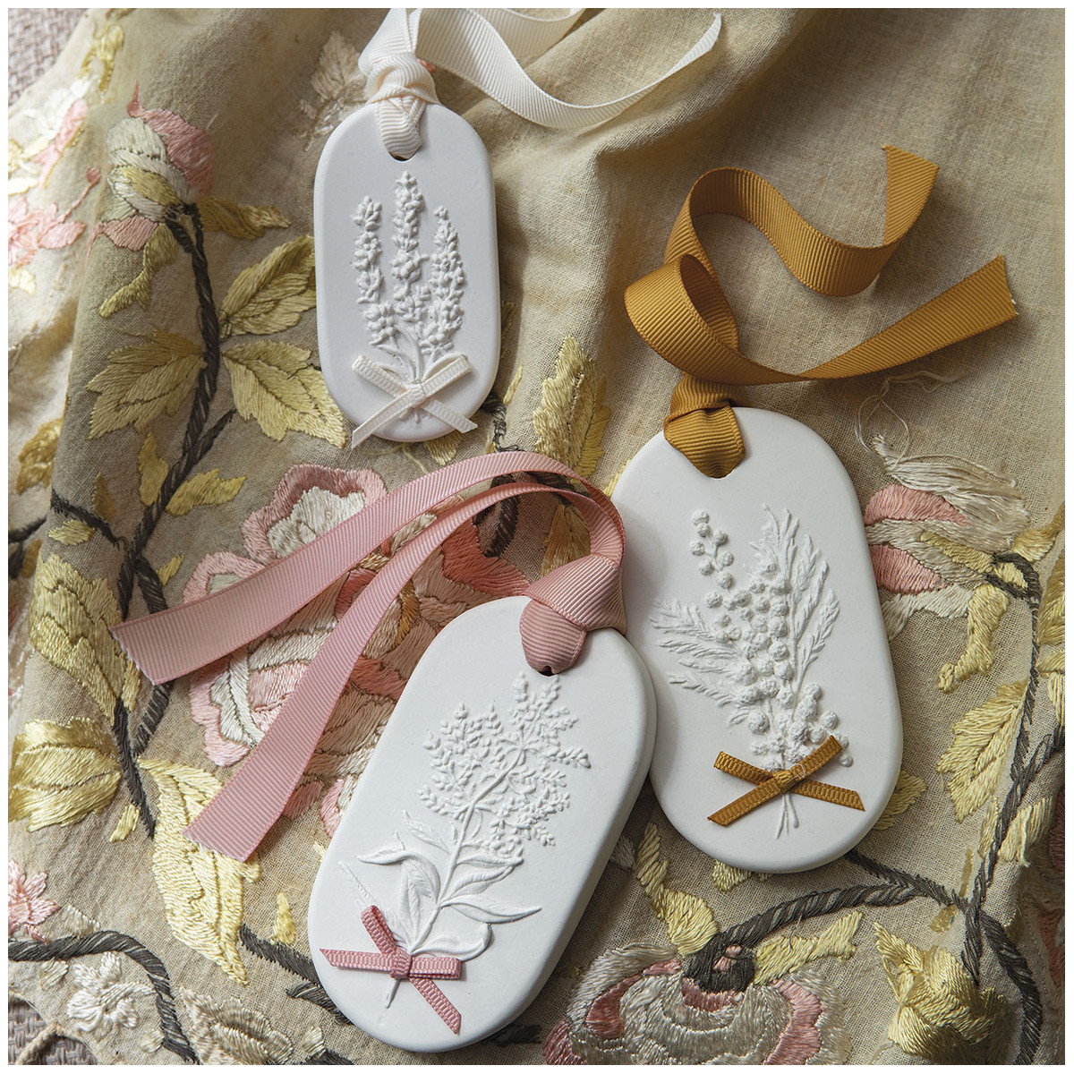 Emblemáticas de la marca, las decoraciones de yeso Mathilde M están delicadamente perfumadas y hechas a mano en nuestros talleres según métodos artesanales por nuestra escultora ornamentista.