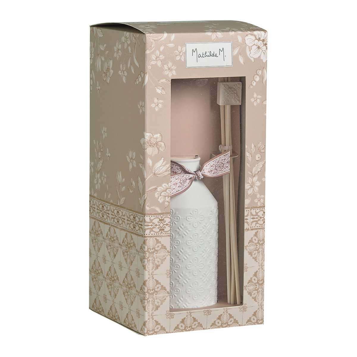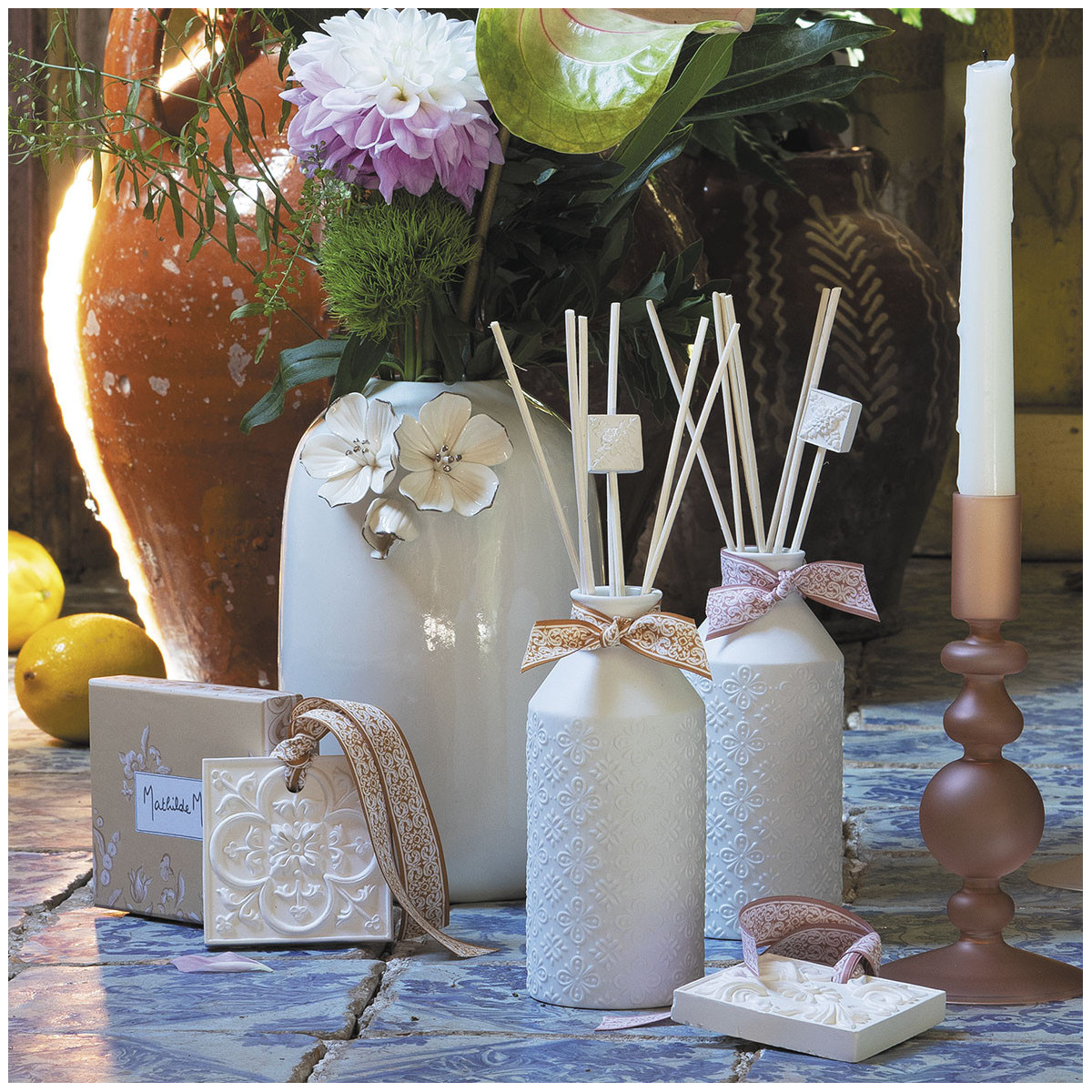 Delicadamente colocadas en el frasco, las varillas de ratán natural se impregnan de fragancia por capilaridad, liberándola luego durante varias semanas.