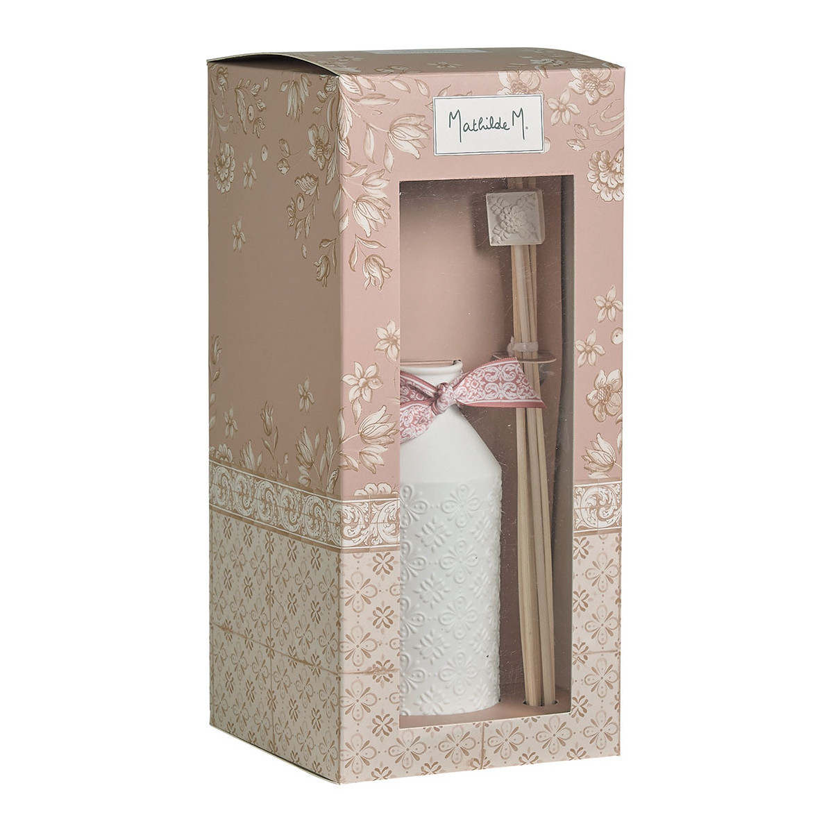 Delicadamente colocadas en el frasco, las varillas de ratán natural se impregnan de fragancia por capilaridad, liberándola luego durante varias semanas.