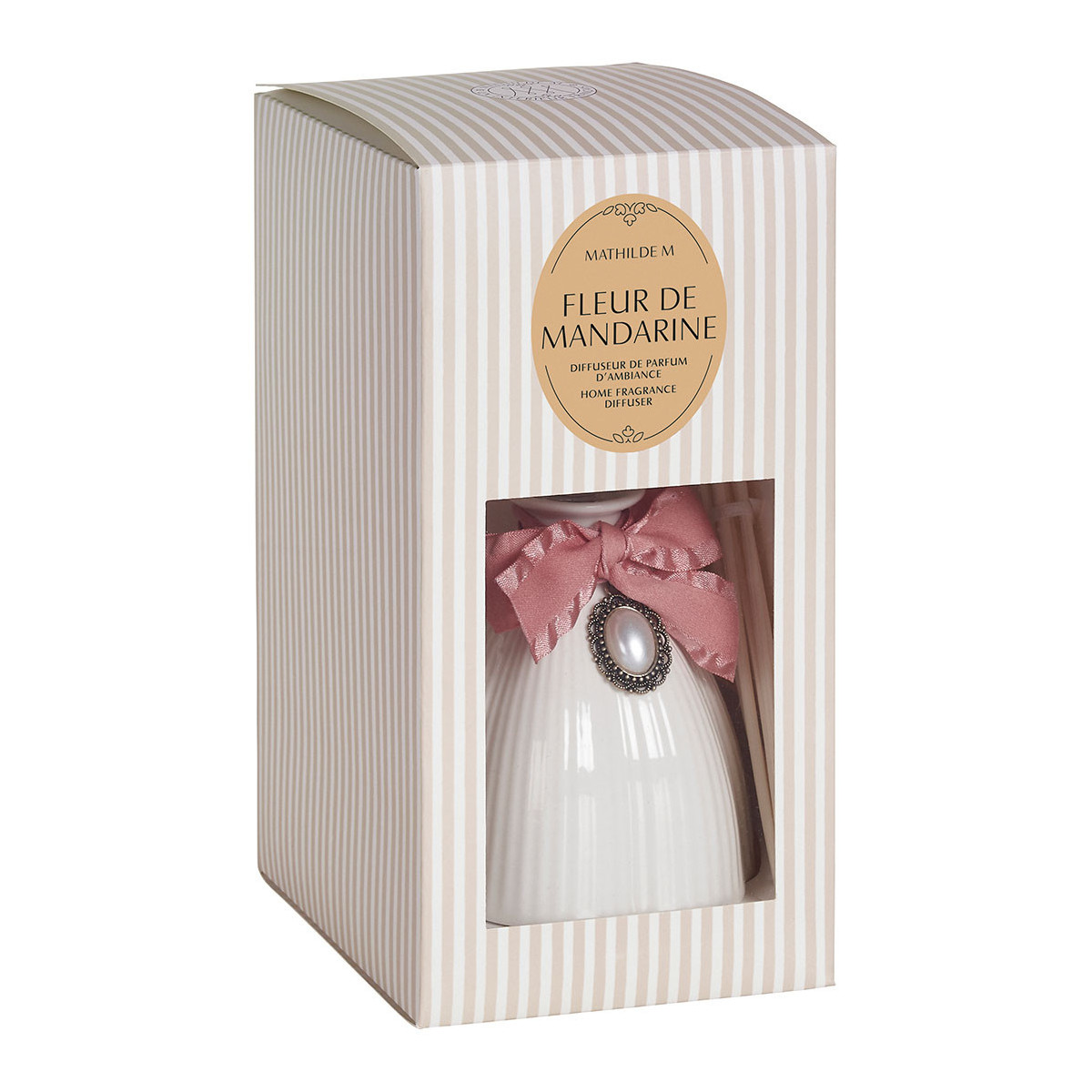 Descubra el difusor de perfume de ambiente Marie-Antoinette con sus elegantes líneas gracias a su frasco de cerámica blanca acanalada, su delicado lazo rosa y su joya. Delicadamente dispuestas en el frasco, las varillas de ratán natural se impregnan de perfume por capilaridad para difundirlo gradualmente en el aire ambiente. Este difusor perfuma durante varias semanas una habitación de tamaño medio. El tapón permite cerrar el frasco y detener la difusión durante sus ausencias prolongadas.