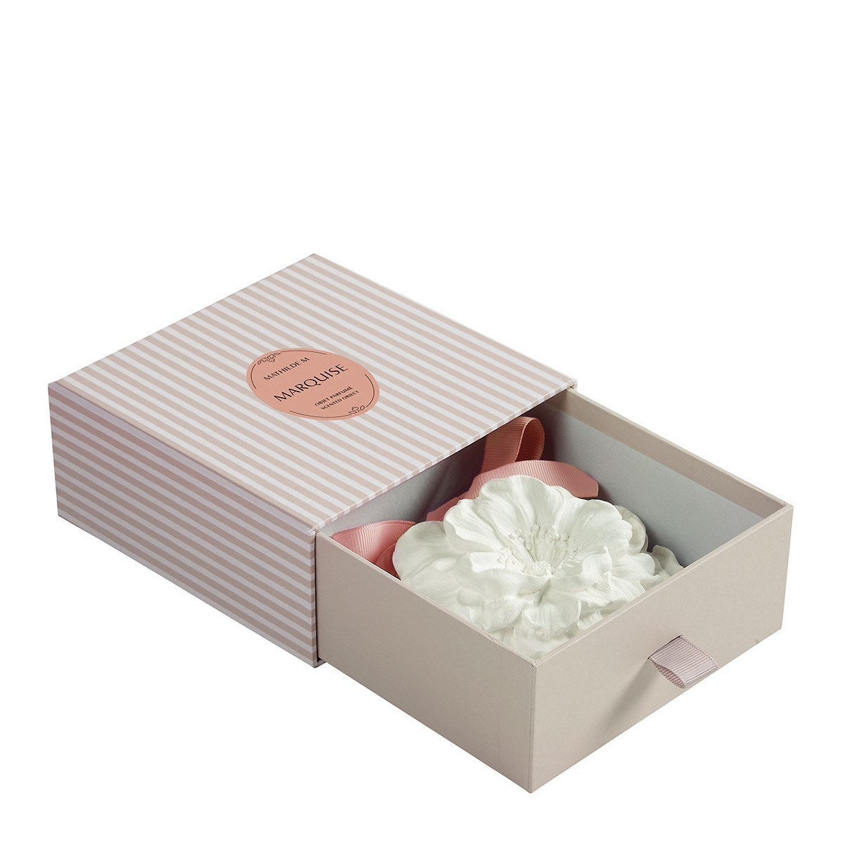 Emblemáticas de la marca, las decoraciones de yeso Mathilde M están delicadamente perfumadas y realizadas a mano en nuestros talleres según métodos artesanales por nuestra escultora ornamentista.