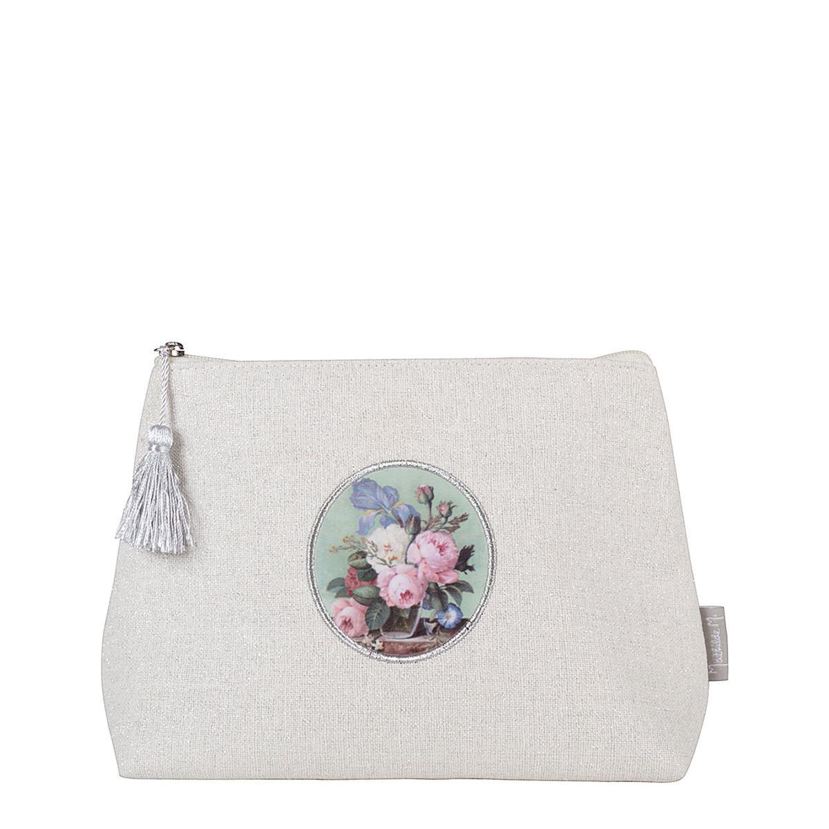 Este neceser le encantará gracias a su delicado medallón con motivo floral, su bonito algodón con brillos y su elegante pompón.