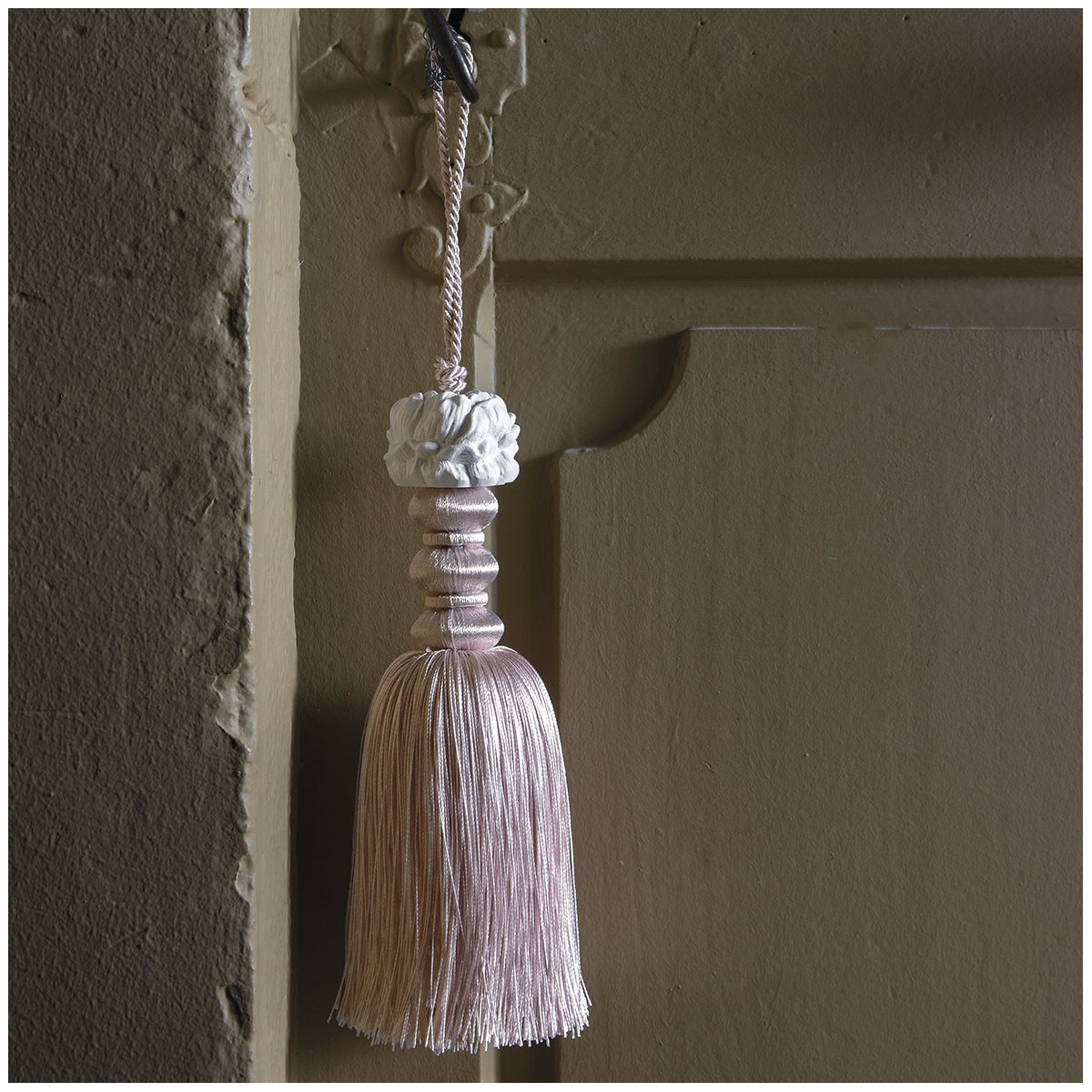 Inspirado en los más bellos pasamanerías, este suntuoso pompón Fleur Royale, adornado con una decoración de yeso perfumado minuciosamente cincelada a mano, difunde su suave fragancia dondequiera que se cuelgue: en las manijas de puertas, cajones o armarios.