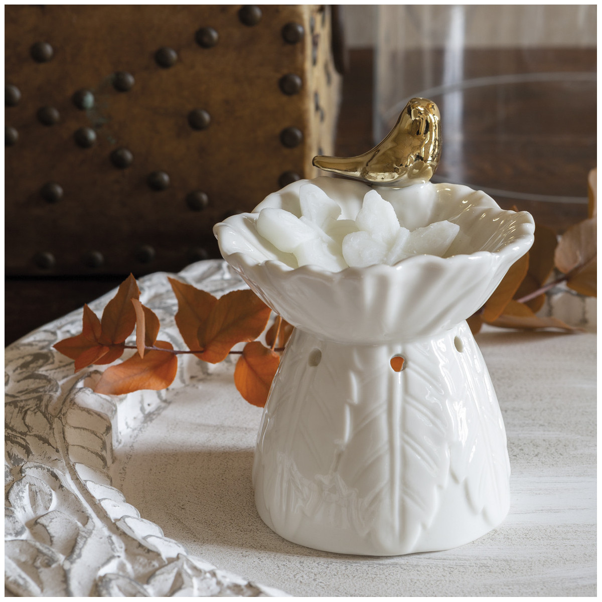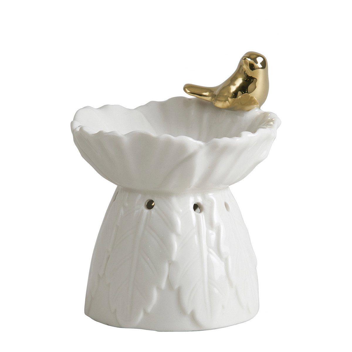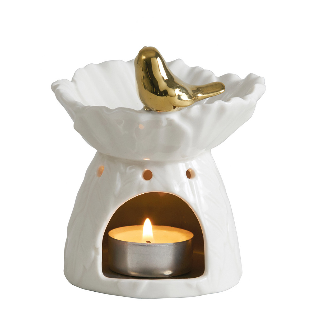 La poesía llega a su interior con este elegante quemador de perfume decorado con motivos vegetales y un delicado pájaro dorado. Permitirá perfumar la habitación mientras difunde la suave luz de su vela.