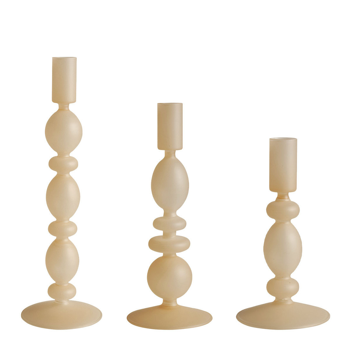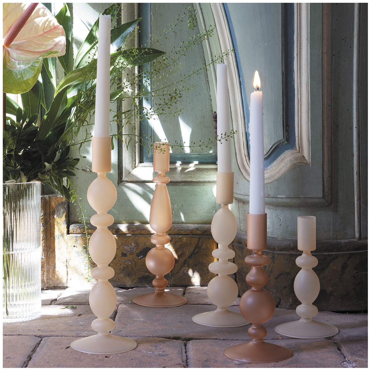 Sucumba ante estos irresistibles candeleros beige escarchado. Su hermoso vidrio opaco y su elegante color aportarán un toque de suavidad a su interior. Podrá combinarlos fácilmente con otras piezas para crear la decoración que le represente.