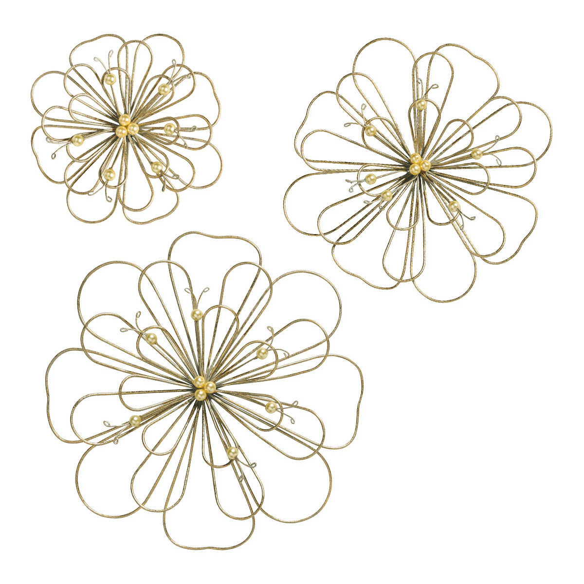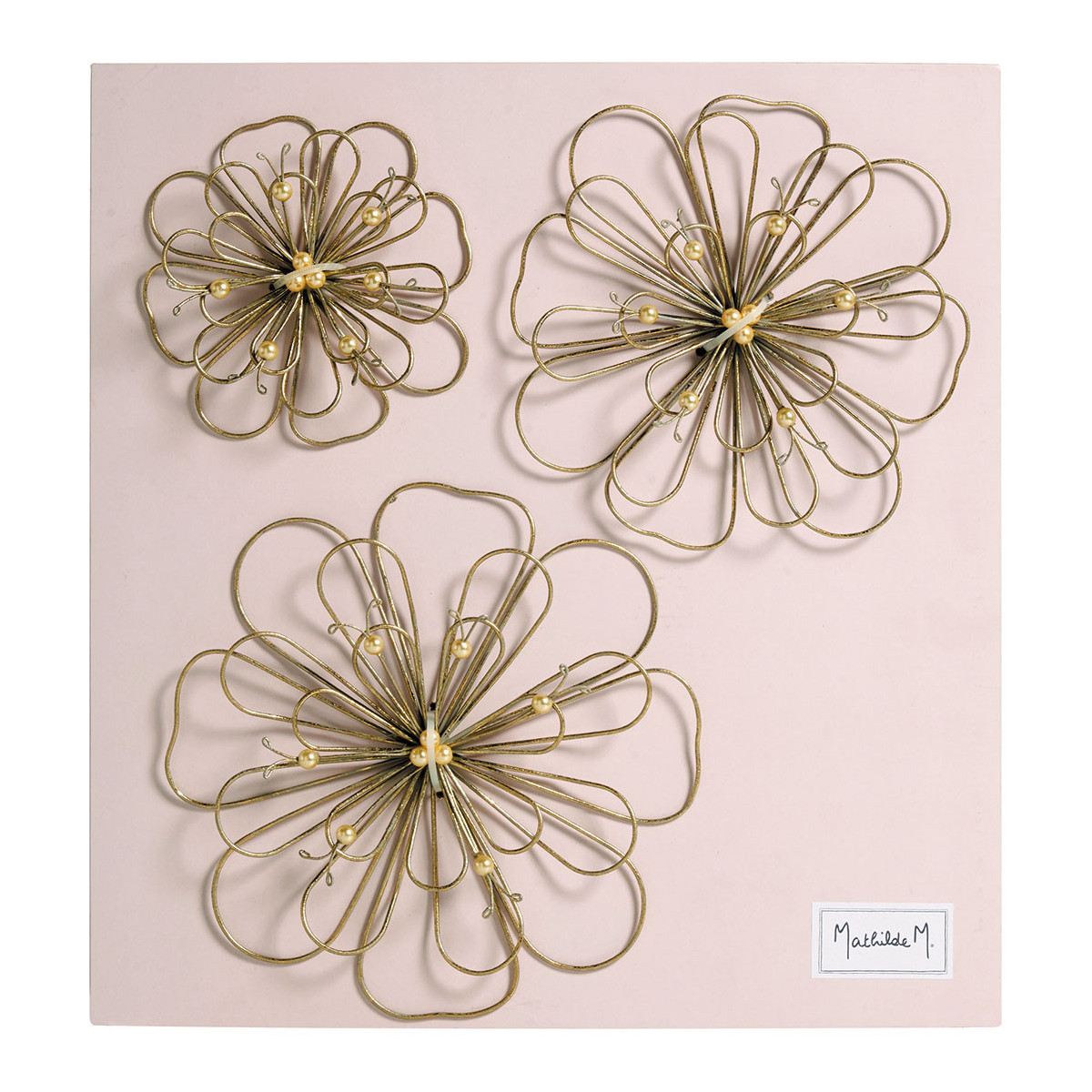 Adorne sus paredes con un toque de elegancia y refinamiento en su decoración mural gracias a este set de 3 Flores de metal con acabado en latón, ornamentadas con sus delicadas perlas.