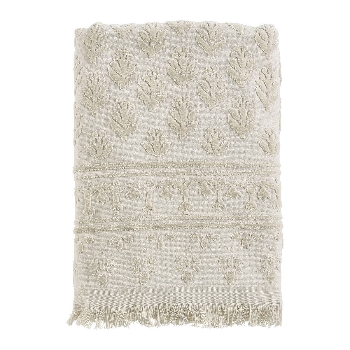 Envuélvase en suavidad con esta elegante toalla de baño Petite Indienne en color crudo con motivos florales de un estampado indio. Suave y ultra absorbente, le ofrecerá un verdadero momento de relajación.