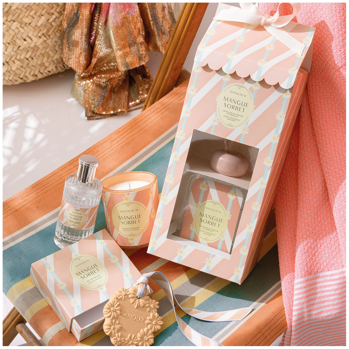 El Estudio de Creación Mathilde M se instala en verano al sol junto al mar y se inspira poéticamente en las emblemáticas cabinas de playa francesas y en el chic de las rayas, ese elemento gráfico atemporal reinterpretado con suavidad y fantasía en esta colección bañada de sol. Un paréntesis estival de colores aterciopelados que visten fragancias inéditas que huelen a verano: el aroma solar del neroli, la suavidad del coco y la adictiva golosidad del mango.