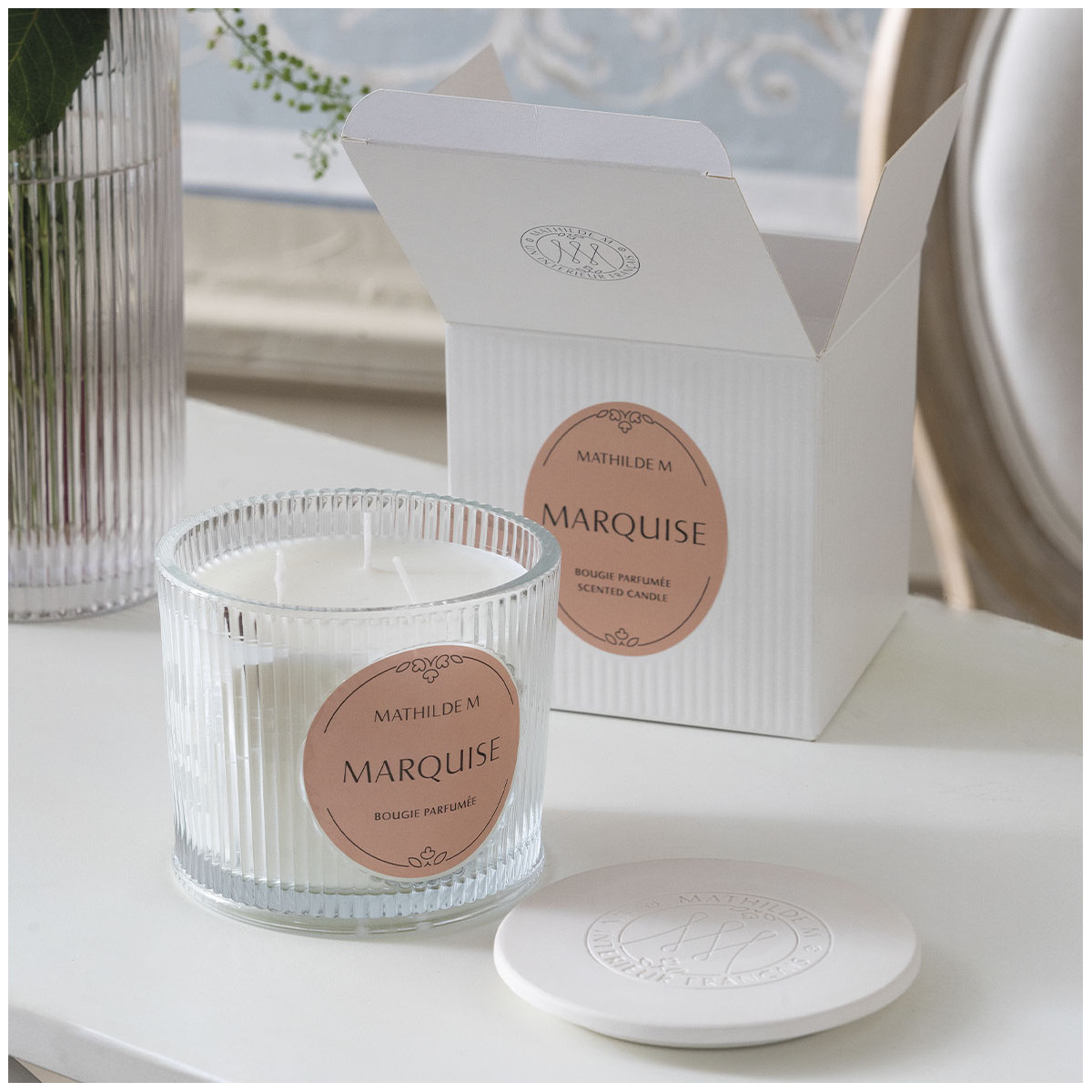 Verdadero objeto decorativo, esta vela Les Intemporelles de formato generoso perfuma agradablemente tanto en frío como en caliente. Su estuche de vidrio acanalado está coronado con una elegante tapa de yeso realizada a mano y marcada con el sello Mathilde M. Cuenta con 3 mechas 100% algodón y está compuesta de una cera de alta calidad, mezcla equilibrada de cera vegetal de soja y cera mineral para garantizar una perfumación óptima. Encendida, crea instantáneamente un ambiente cálido en tu interior.