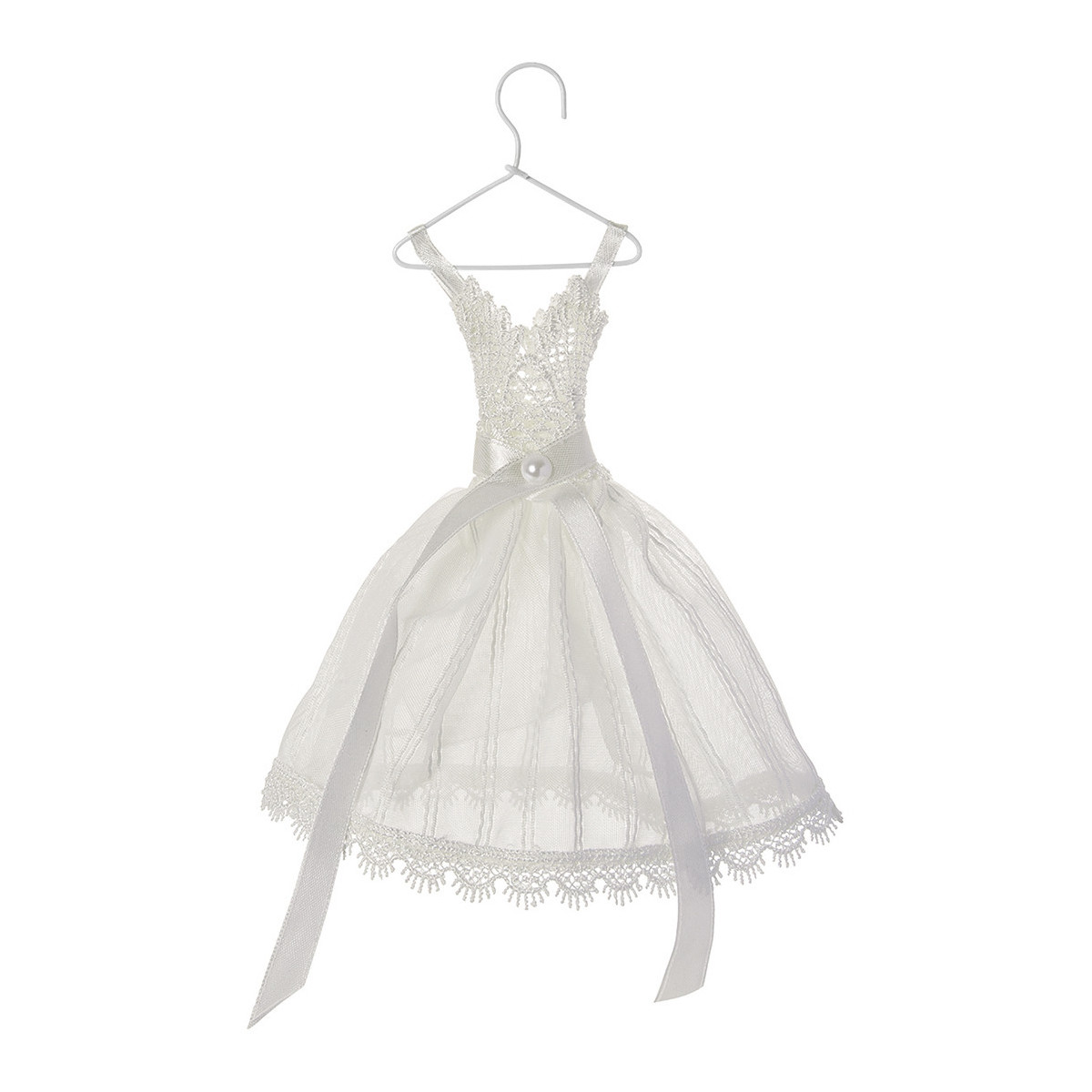 Este elegante vestido de novia de encaje y organza permite disimular pequeños regalos o simplemente un yeso perfumado. Gracias a su percha, podrás colocarlo en tu armario, pero también utilizarlo para contener peladillas o un pequeño regalo para invitados, colgándolo de un vaso.