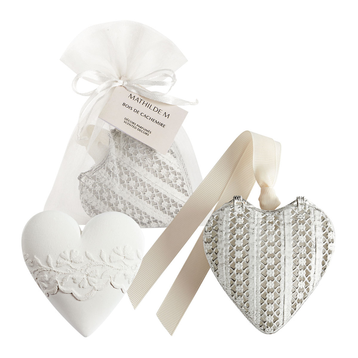 Apportez une touche de romantisme et de délicatesse à votre intérieur avec cet irrésistible bijou décoratif en métal en forme de cœur. Inspiré du charme d’antan, il révèle de sublimes détails ciselés et renferme un joli cœur en plâtre parfumé. Son délicat ruban vient parfaire cette création et lui apporte une touche féminine et élégante, fidèle à l’esprit raffiné de Mathilde M. À accrocher à une porte, suspendre à une poignée ou simplement à disposer sur un meuble.