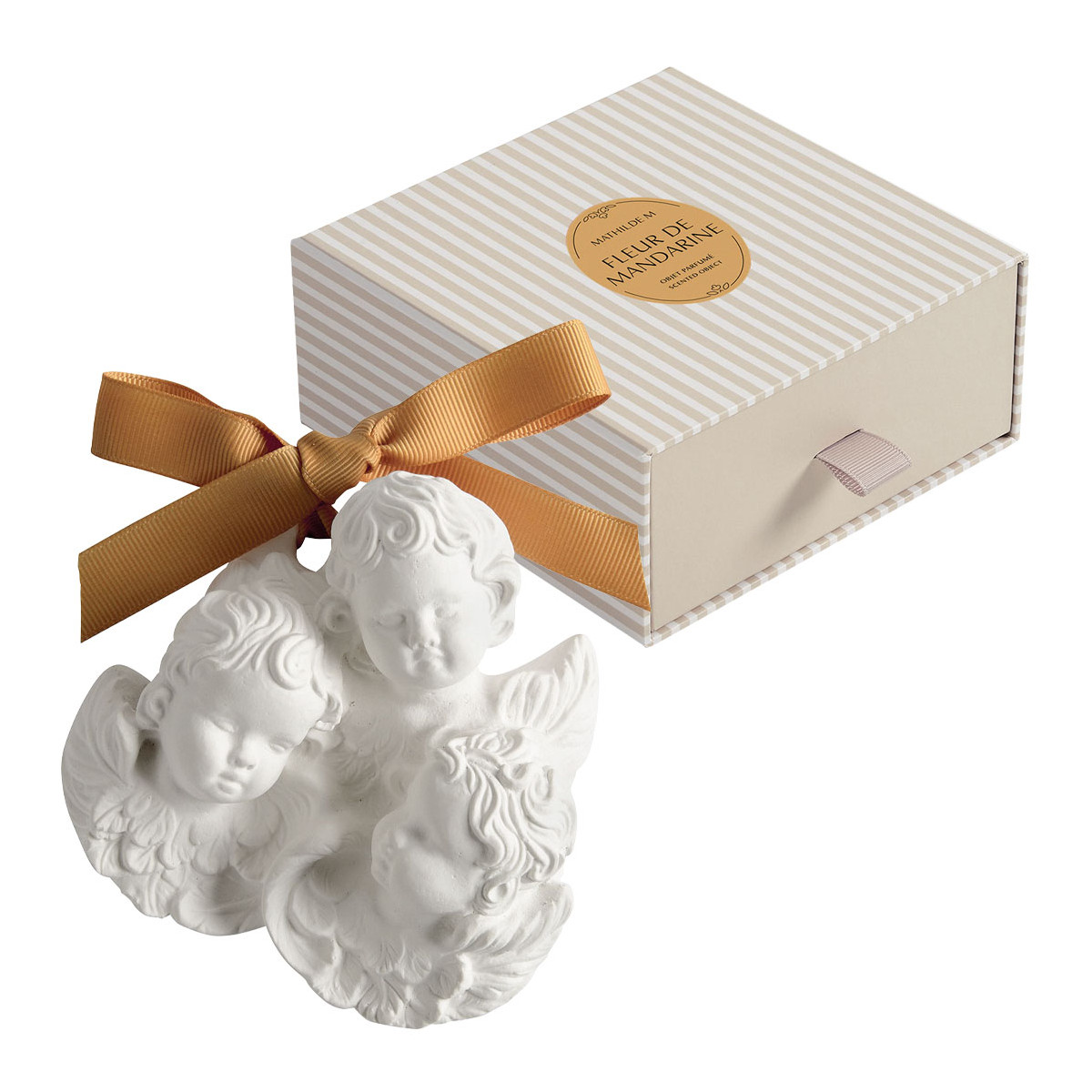 Entièrement réalisé à la main, ce trio d'Angelots en plâtre, aux visages tendres et bienveillants, parfumera délicatement et pour longtemps tous les petits espaces de votre maison comme les armoires, tiroirs ou bagages. Posé dans une coupelle sur une table, il se transforme en véritable objet précieux décoratif.