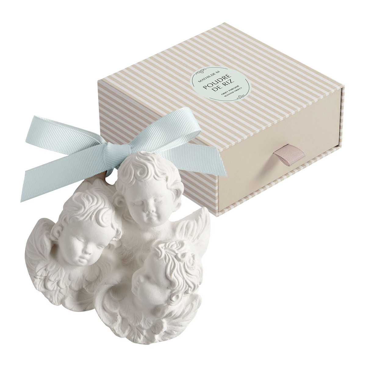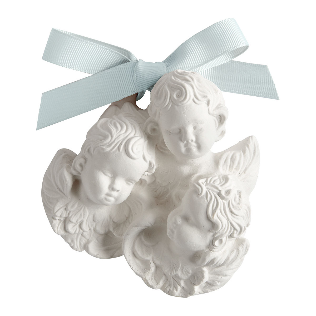 Entièrement réalisé à la main, ce trio d'Angelots en plâtre, aux visages tendres et bienveillants, parfumera délicatement et pour longtemps tous les petits espaces de votre maison comme les armoires, tiroirs ou bagages. Posé dans une coupelle sur une table, il se transforme en véritable objet précieux décoratif.