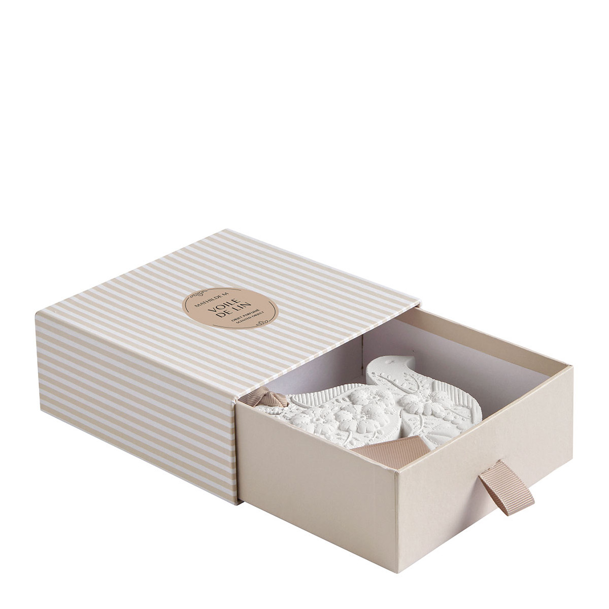 Entièrement réalisée à la main, cette colombe en plâtre inspirée du boutis provençal, parfume délicatement et pour longtemps tous les petits espaces de votre maison comme les armoires, tiroirs ou bagages. Posée dans une coupelle sur une table, elle se transforme en véritable objet précieux décoratif.