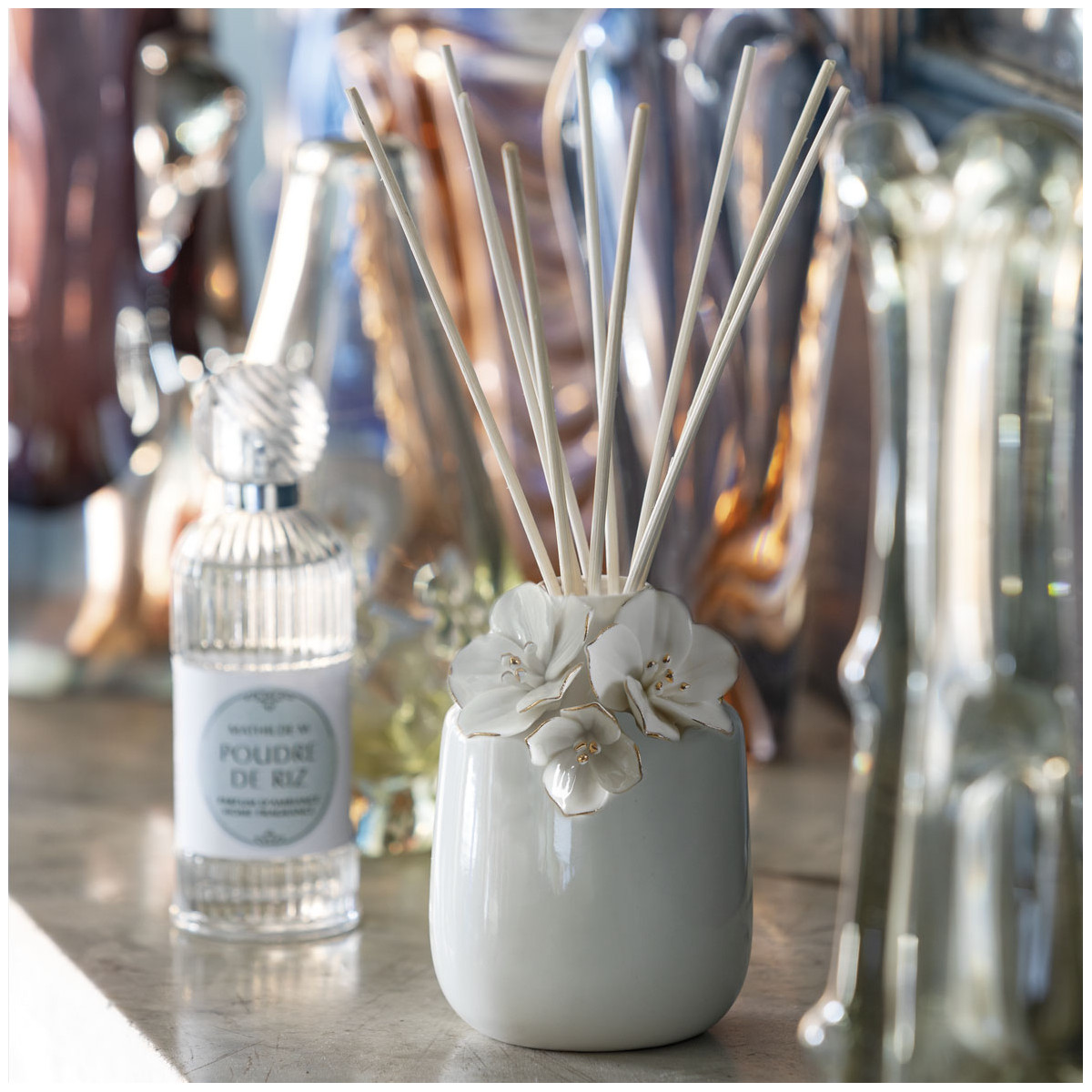Découvrez l'élégant diffuseur de parfum d'ambiance Amour de Fleurs habillé de fleurs raffinées dorées à la main. Délicatement disposées dans le flacon, les tiges en rotin naturel s'imprègnent de parfum par capillarité pour le diffuser progressivement dans l'air ambiant. Ce diffuseur parfume pendant plusieurs semaines une pièce de taille moyenne.