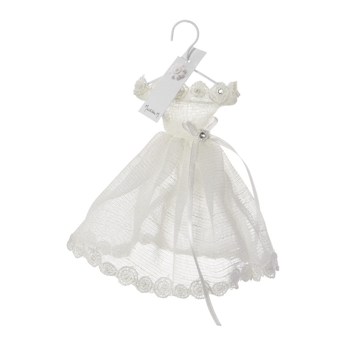 Questo elegante abito da sposa in pizzo e organza permette di nascondere piccoli regali o semplicemente un gesso profumato. Grazie alla sua gruccia, potrete riporlo nel vostro armadio, ma anche utilizzarlo per contenere confetti o un piccolo regalo per gli ospiti, appendendolo a un bicchiere.