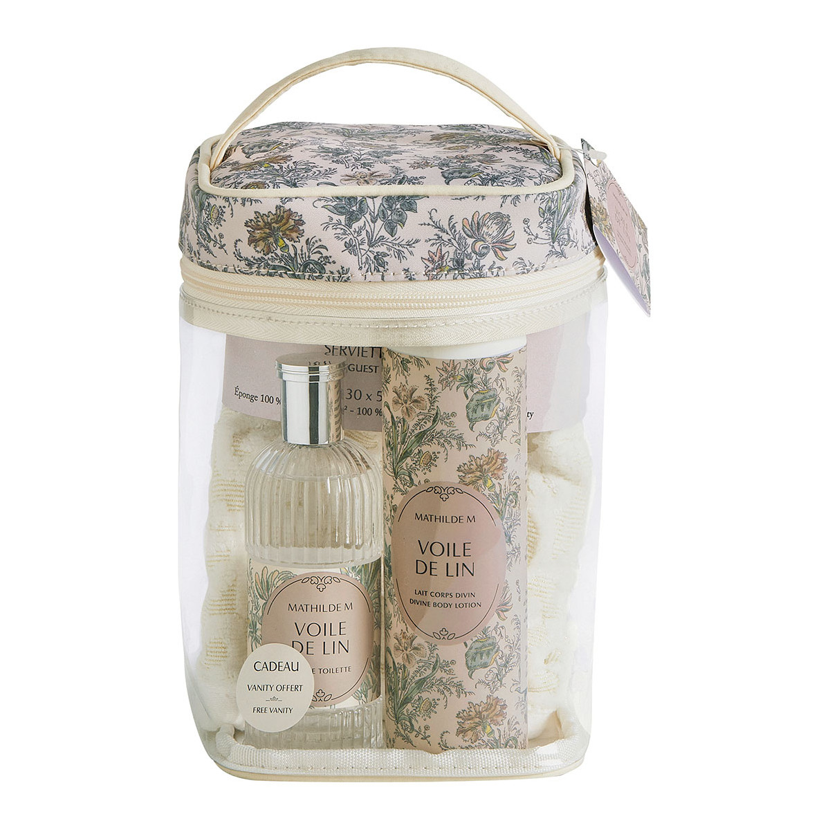 Lasciatevi conquistare dal profumo Voile de Lin, che evoca il ricordo delle note di biancheria pulita sfuggite da un bell'armadio antico... Una fragranza avvolgente con note polverose di rosa e violetta, che si fondono su un letto di muschio bianco bordato di fiori di lino.nnScoprite un'idea regalo raffinata con questo adorabile beauty case che contiene un'eau de toilette, un latte corpo e un asciugamano ospite. La nostra eau de toilette profuma intensamente la pelle, lasciando una scia incantevole al vostro passaggio. Avvolgete il vostro corpo di morbidezza con il nostro Latte Divin profumato formulato con il 96% di ingredienti di origine naturale. Arricchito con olio di macadamia e burro di karité, la sua texture cremosa sublima la vostra pelle e le dona una deliziosa sensazione di comfort. Infine, lasciatevi affascinare dalla raffinatezza dell'asciugamano ospite i cui eleganti motivi floreali sono sublimati da una delicata bordura dorata. Realizzato in cotone di qualità, avvolgerà la vostra pelle di morbidezza grazie alla sua irresistibile texture soffice e alla sua generosa dimensione.nnIl loro elegante motivo ispirato al XVIII secolo è stato interamente disegnato a mano dal nostro Studio di Creazione per riflettere la personalità e le note sottili del profumo.nnQuesto cofanetto contiene:n1 eau de toilette 100 ml, profumo Voile de Linn1 latte corpo 250 ml, profumo Voile de Linn1 asciugamano ospite in cotonennBuono a sapersinLa nostra gamma di cosmetici è prodotta in Francia, vicino a Montpellier, a partire da ingredienti di origine naturale di qualità.nSofisticati e di alta qualità, i nostri profumi sono elaborati in stretta collaborazione con Maestri Profumieri di Francia e d'Europa e costituiti da un assemblaggio lavorato di numerose note.nOgni creazione profumata è immaginata dal nostro team di designer in Francia e composta da pezzi con dettagli raffinati e rivisita un'arte di vivere tipicamente francese.nnInformazioni complementarinComposizione profumo: vedi CaratteristichenComposizione asciugamano: spugna 100% cotone 600 g/m²nCapacità eau de toilette: 100 mlnCapacità latte corpo: 250 mlnDimensioni eau de toilette: ø 5 x 13,8 cmnDimensioni latte corpo: ø 4,5 x 18 cmnDimensioni asciugamano: 30 x 50 cmnDimensioni beauty case: 13,4 x 20,6 x 13,3 cm