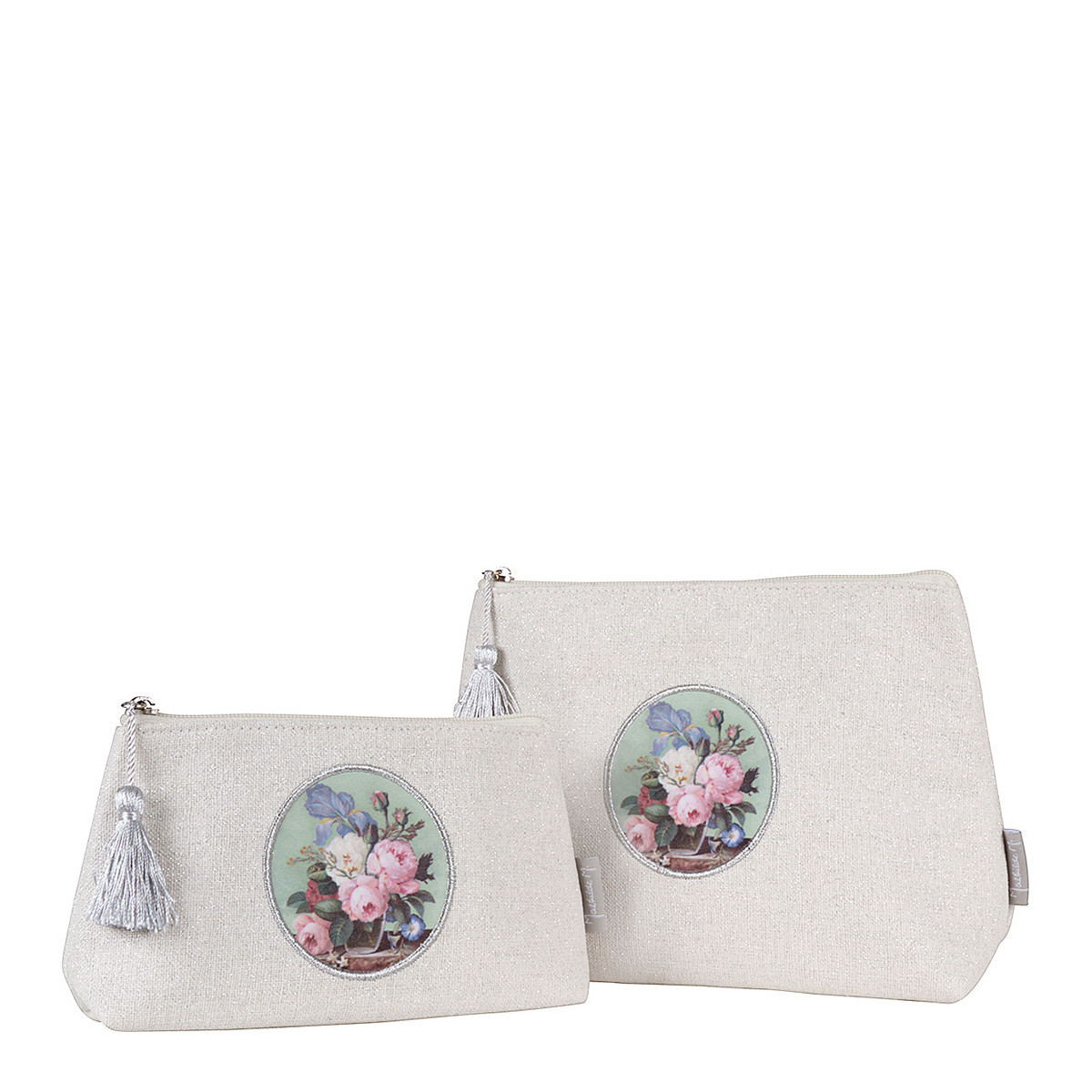 Questo beauty case saprà incantarvi grazie al suo delicato medaglione con motivo floreale, il suo grazioso cotone glitterato e il suo elegante pompon.