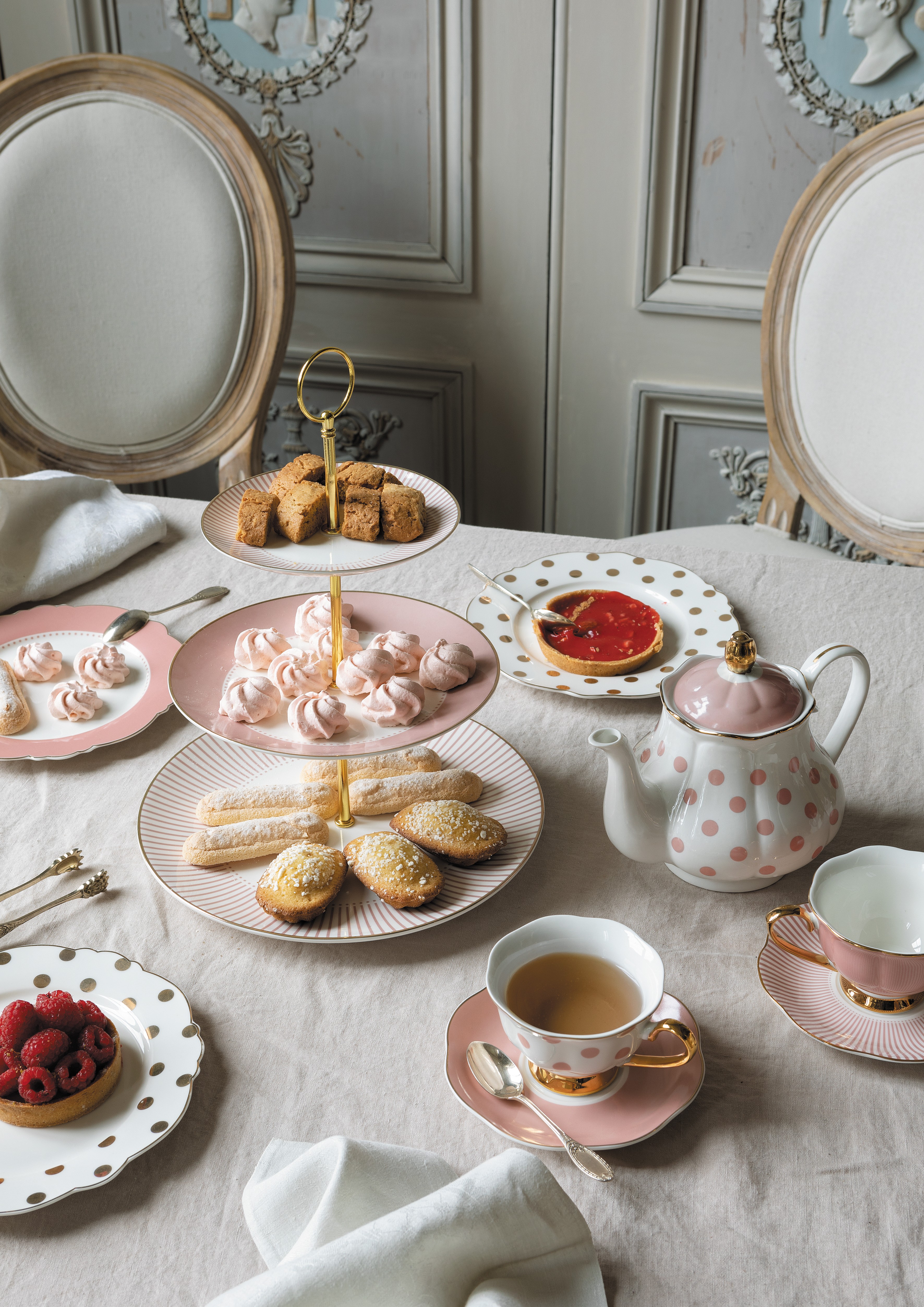 L'emblematica linea di stoviglie Madame de Récamier è disponibile in diverse tonalità e motivi. Questa collezione include piatti piani, piatti fondi e piatti da dessert. Ci sono anche ciotole, tazze, tazzine da caffè e tazze da tè. Per i più golosi, Mathilde M propone un alzata per dolci a tre piani, ideale per la merenda.