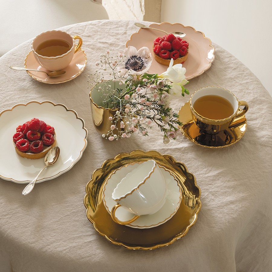 Lasciatevi affascinare dalla linea di stoviglie Marguerite grazie alle sue curve che ricordano quelle di un delicato fiore. Queste ultime aggiungono con dolcezza un tocco di poesia alla vostra tavola. Festonata e bordata con un elegante profilo dorato, sarà perfetta per tutte le occasioni.