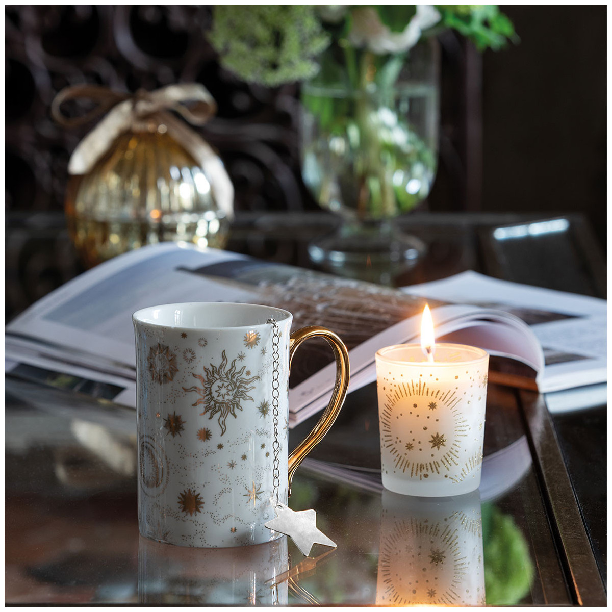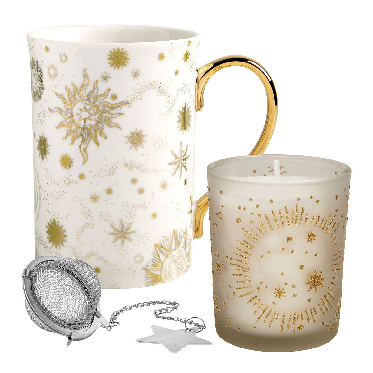 Scopri il nostro delizioso cofanetto Festa Celeste. Contiene una delicata candela, una tazza e un infusore per tè, con decorazioni ispirate alla bellezza degli astri. Regala ai tuoi cari il rituale profumato ideale per un momento di relax: una candela accesa in salotto e un delizioso tè per riscaldarsi. La candela diffonde una luce soffusa e un profumo delicato per creare istantaneamente un'atmosfera accogliente e calorosa in tutta la casa. Realizzata con uno stoppino 100% cotone e una cera di alta qualità, garantisce una diffusione ottimale del profumo e rilascia la sua fragranza in modo costante durante tutta la combustione con un'eccellente resa olfattiva sia a caldo che a freddo.