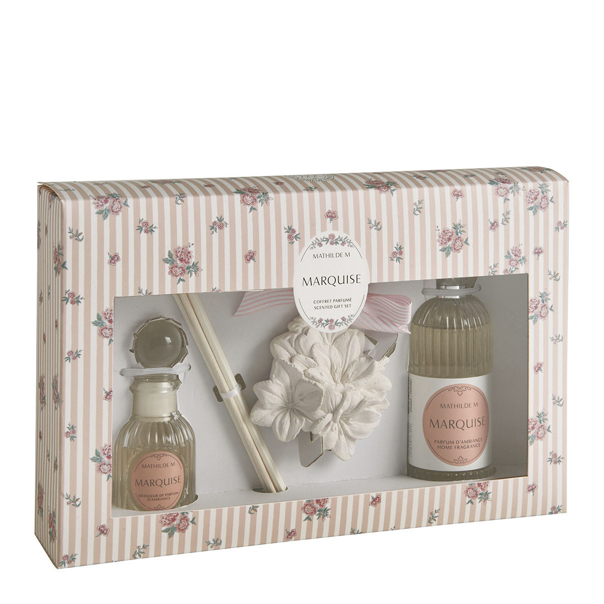 Questo cofanetto contiene un diffusore di profumo per ambienti, uno spray per ambienti e una graziosa decorazione in gesso profumato minuziosamente cesellata a mano. Un'irresistibile idea regalo, da regalare o semplicemente per farsi un piacere!