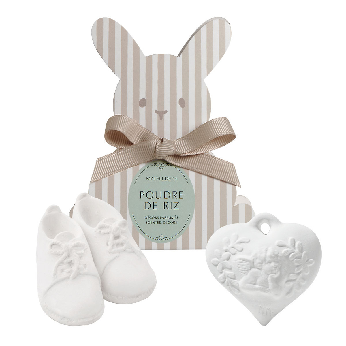 Sorprendete i vostri ospiti per un battesimo o un compleanno con questa graziosa confezione Surprises parfumées a forma di coniglio. Contiene due decorazioni in gesso profumato interamente realizzate a mano. Ogni decorazione è ideale per profumare delicatamente e a lungo tutti i piccoli spazi della vostra casa come armadi, cassetti o bagagli.