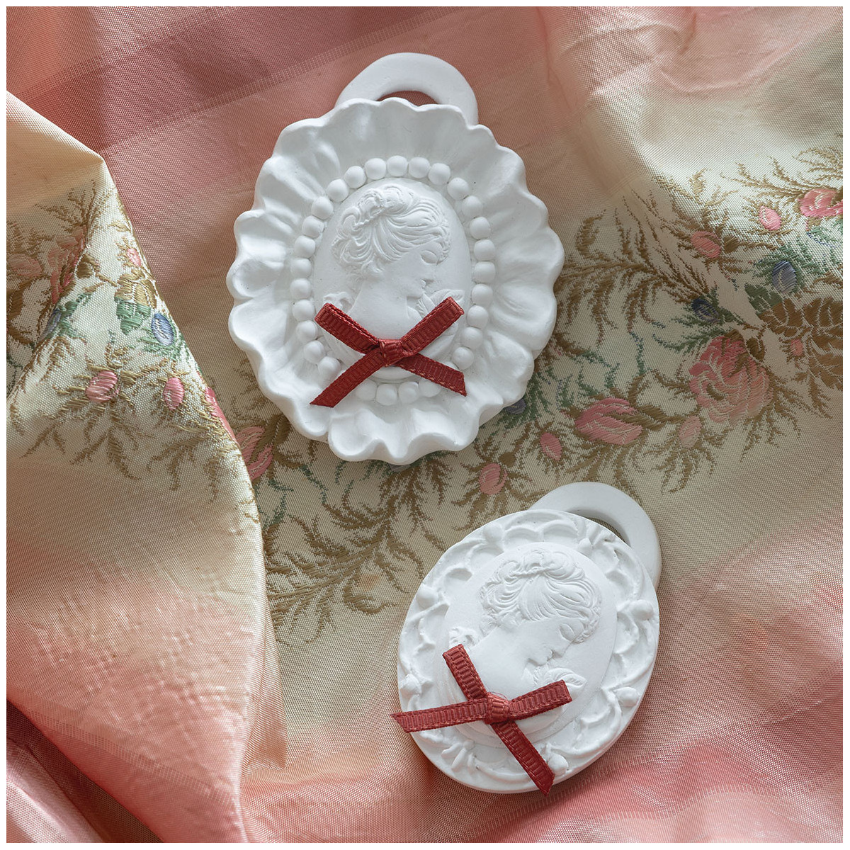 Realizzato interamente a mano, questo decoro in gesso rappresenta un bellissimo Medaglione cammeo ispirato al XVIII secolo. Profumerà delicatamente e a lungo tutti i piccoli spazi della tua casa come armadi, cassetti o bagagli.