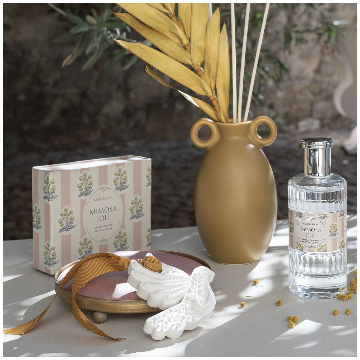 Mimosa Joli, una fragranza luminosa e confortante dove la freschezza del petit grain e del bergamotto si sposa al mimosa con muschi delicati in sillage.