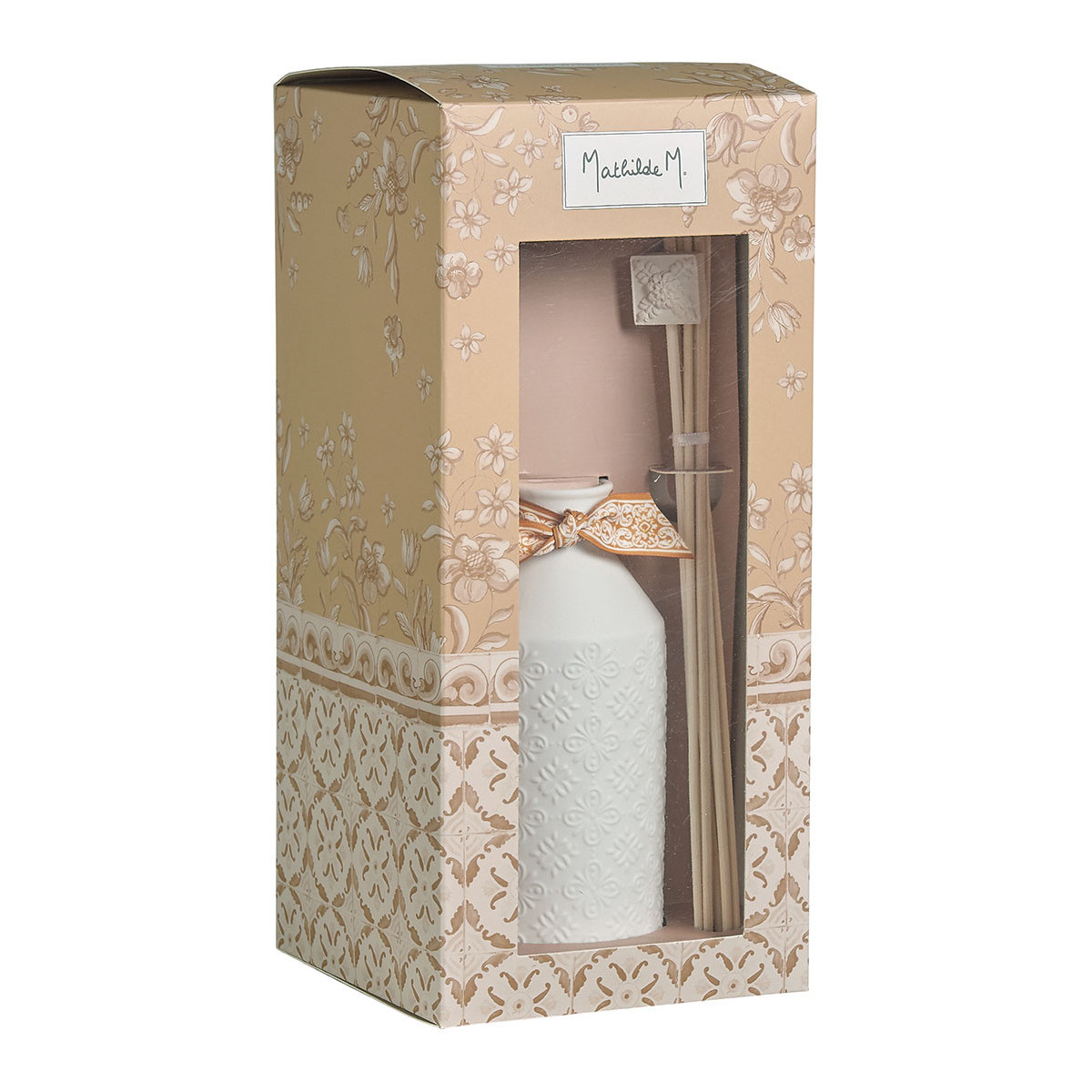 Delicatamente disposte nel flacone, le bacchette in rattan naturale si impregnano di profumo per capillarità, rilasciandolo poi per diverse settimane.