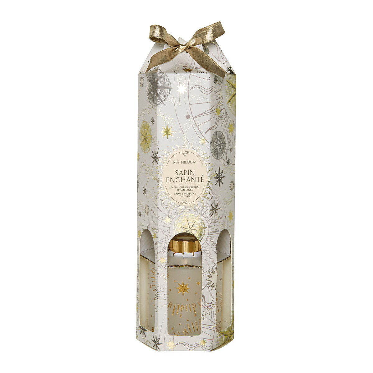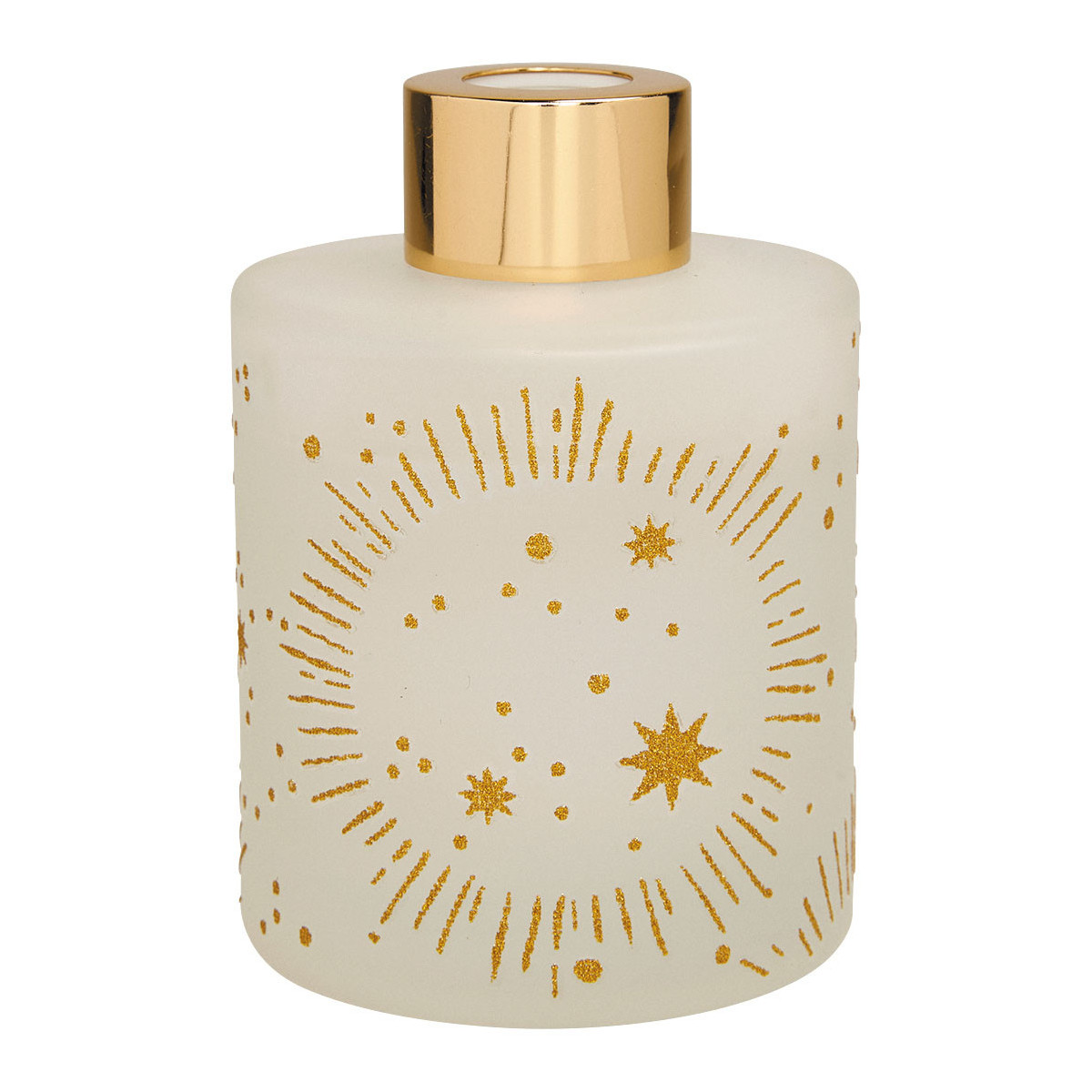 Scoprite tutta l'eleganza e la delicatezza del diffusore di profumo per ambienti Festa Celeste. Con i suoi motivi dorati glitterati serigrafati, questo vero e proprio oggetto di decorazione ispirato alla bellezza degli astri profuma per diverse settimane una stanza di medie dimensioni. Delicatamente disposte nel flacone, le bacchette in midollino sbiancato si impregnano di profumo per capillarità per diffonderlo gradualmente nell'aria circostante.