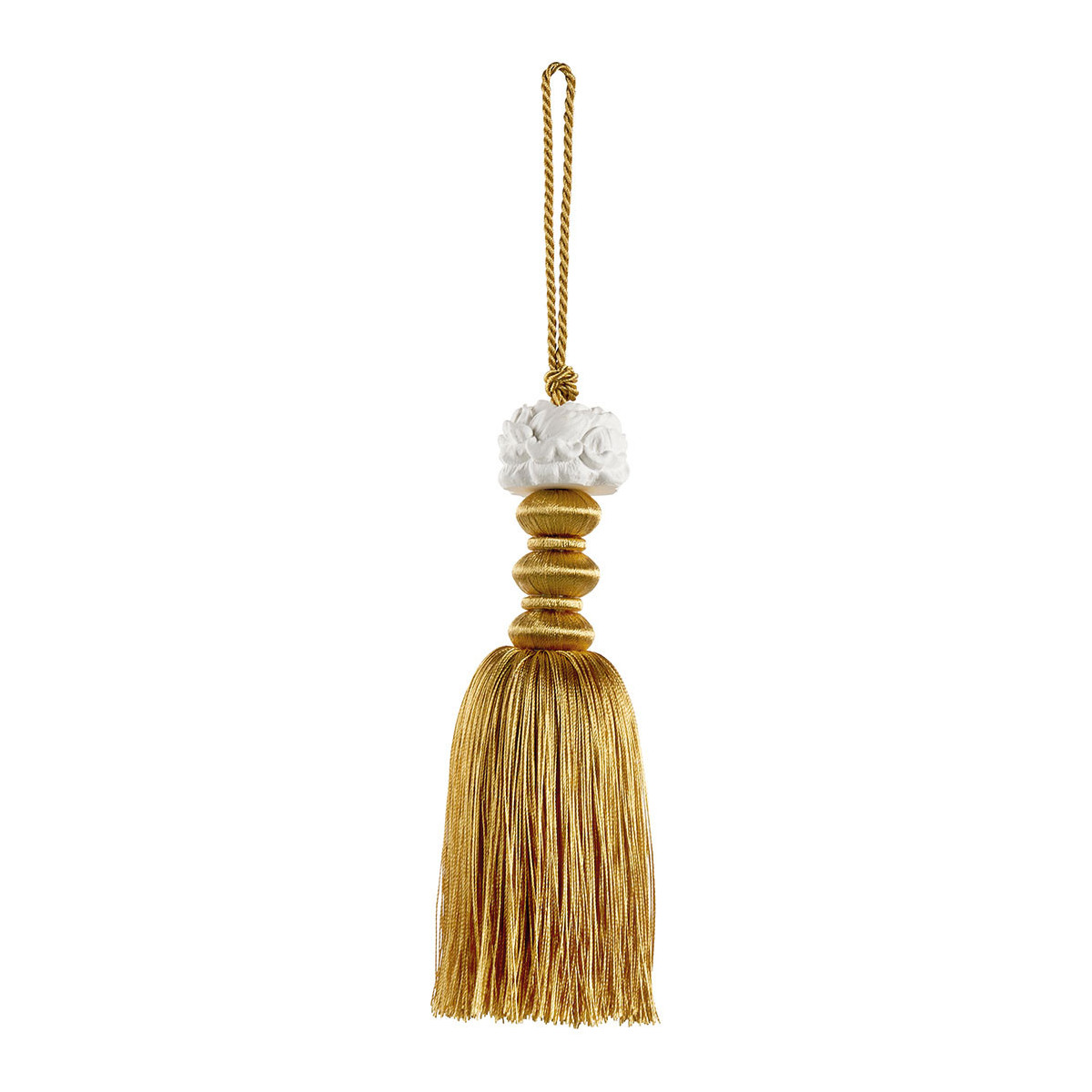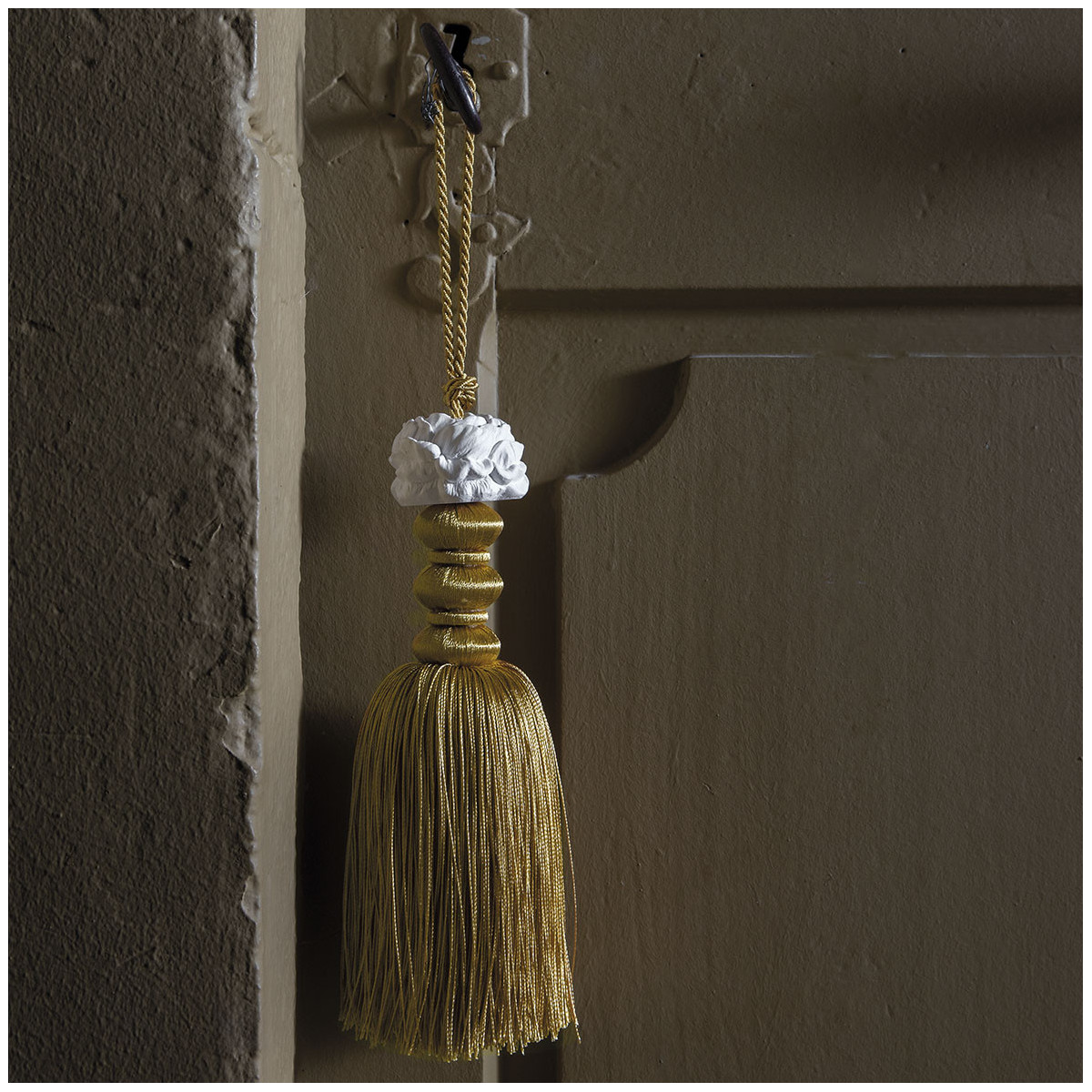Ispirato alle più belle passamanerie, questo sontuoso pompon Fleur Royale, decorato con un ornamento in gesso profumato minuziosamente cesellato a mano, diffonde il suo dolce profumo ovunque venga appeso: sulle maniglie delle porte, dei cassetti o degli armadi.