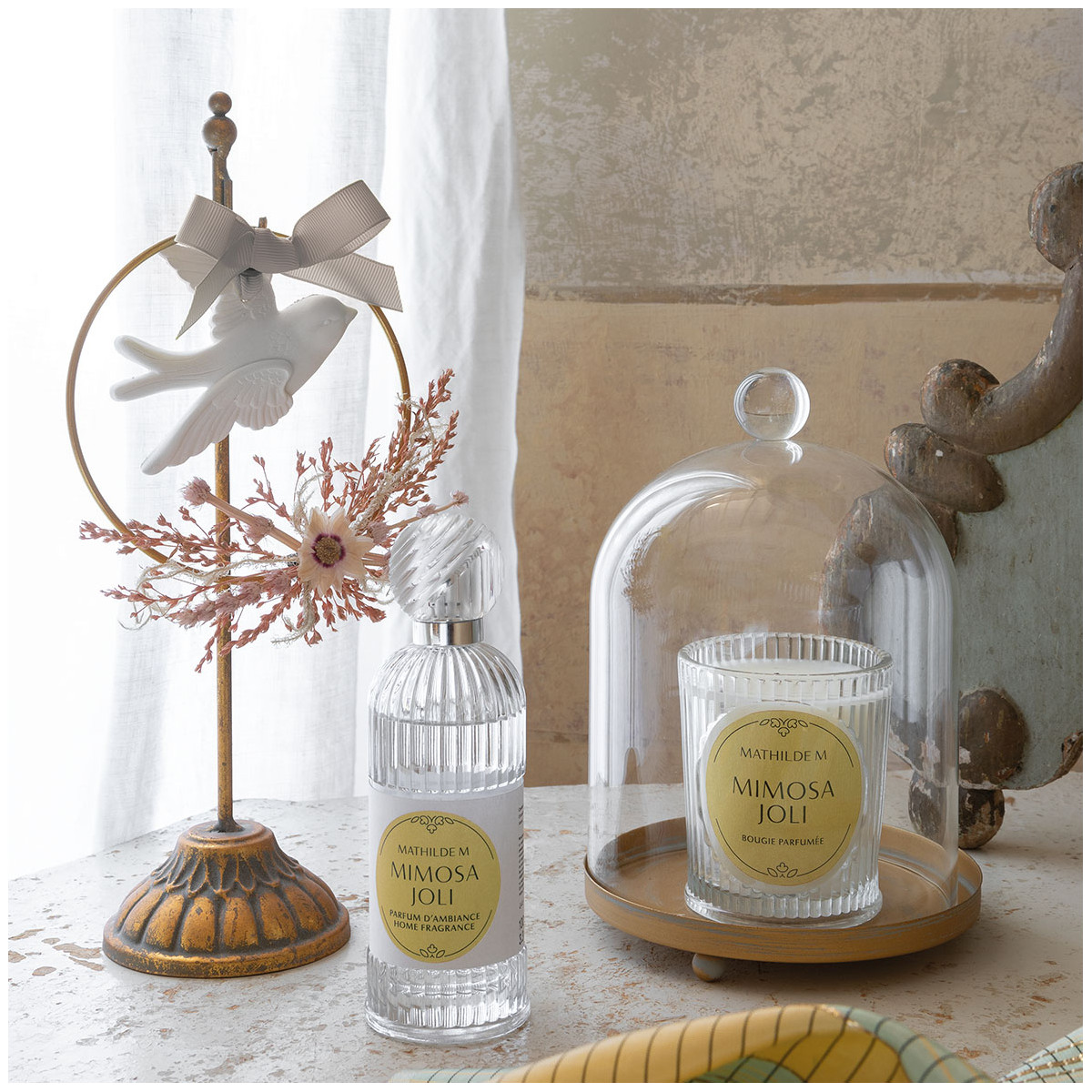 Mimosa Joli, una fragranza luminosa e confortante in cui la freschezza del petit grain e del bergamotto si sposa con il mimosa con delicati muschi nel fondo.
