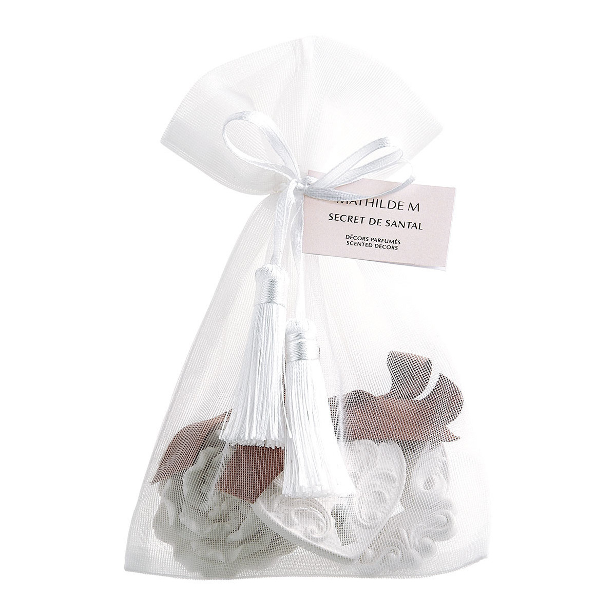 Perfetto da regalare o da regalarsi, questo elegante sacchetto contiene 3 meraviglie profumate interamente cesellate a mano. Queste piccole decorazioni in gesso profumano delicatamente e a lungo tutti i piccoli spazi della vostra casa come armadi, cassetti o bagagli.